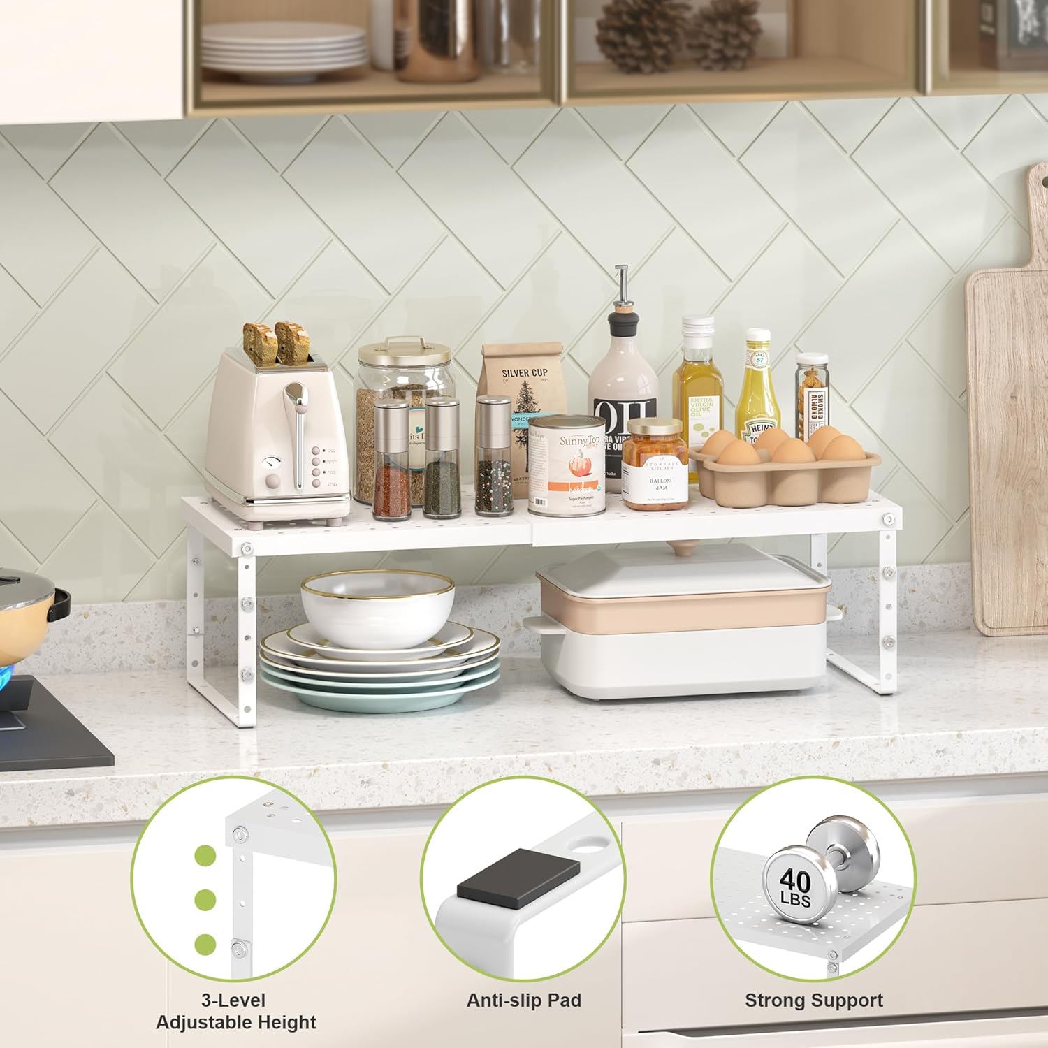 - 【Heavy Duty Metal Shelf Riser】Pantry organizer shelves rack is made of premium metal pannel with thicken powder coating, our kitchen counter shelf is strong, rustproof, and easy to clean, ensuring long-lasting use. Stackable countertop organizer is powerful enough to hold up to 40lb each pack. Shelf organizer is capable of holding a variety of kitchen utensils, including spice bottles, cans, and even toasters.