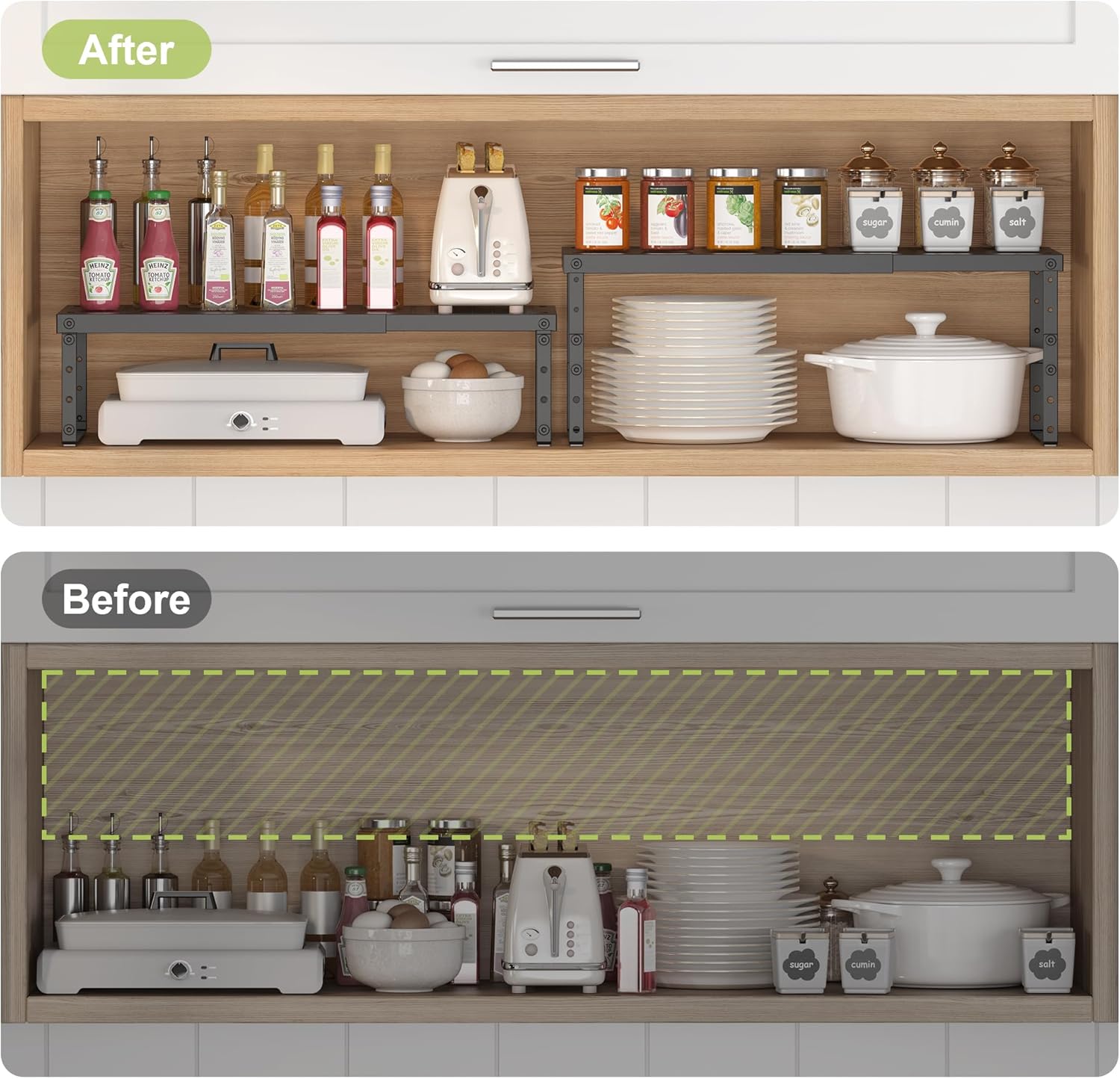 - 【Adjustable & Stackable Shelf Rack】The height of this pantry organizer shelf riser can be adjusted in 3-level:5.1-6.3-7.5 inch, which means whether it is a tall bottle, a deep plate or a large jar, you will be able to find the best height for them. It also can be easily stacked to a 2-tired kitchen counter shelf, or used separately as 2 single kitchen cabinet organizer. An ideal solution for kitchen organizer and storage---maximizing your limit space.