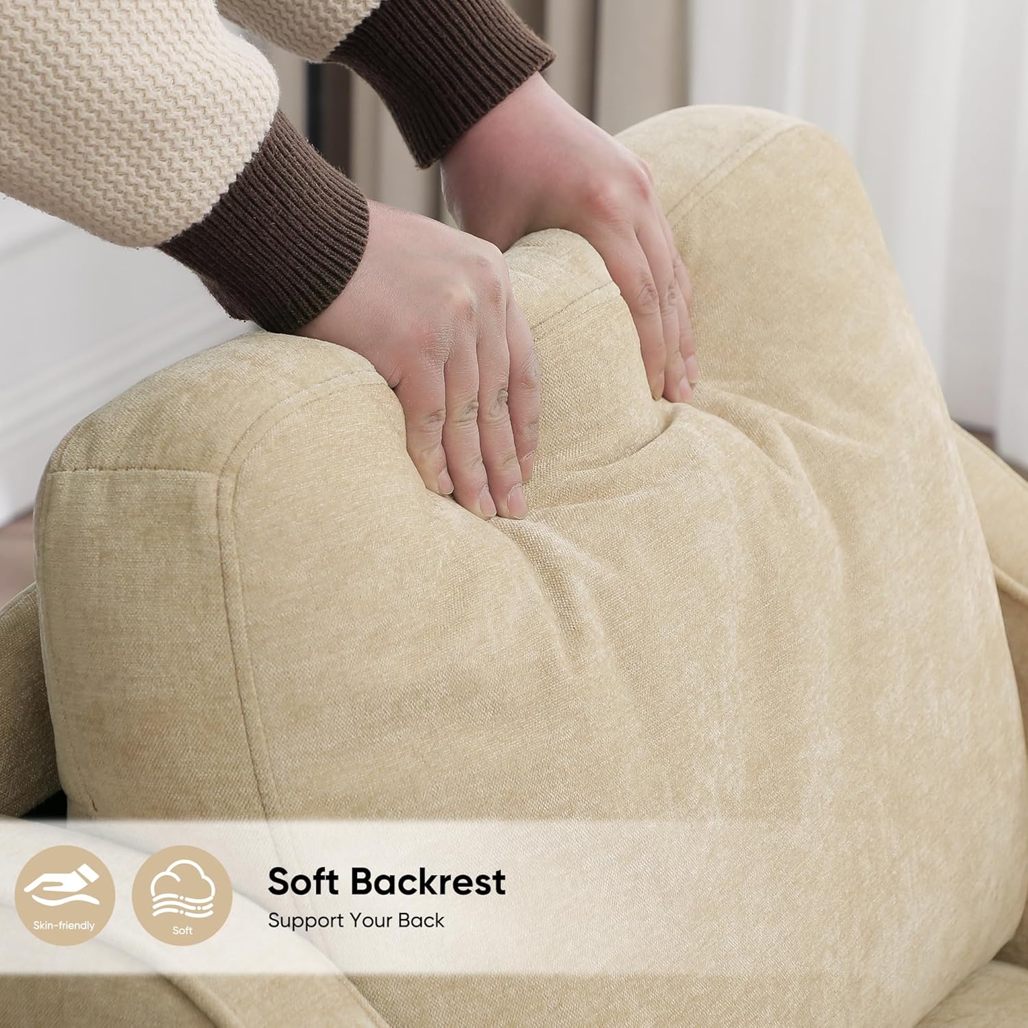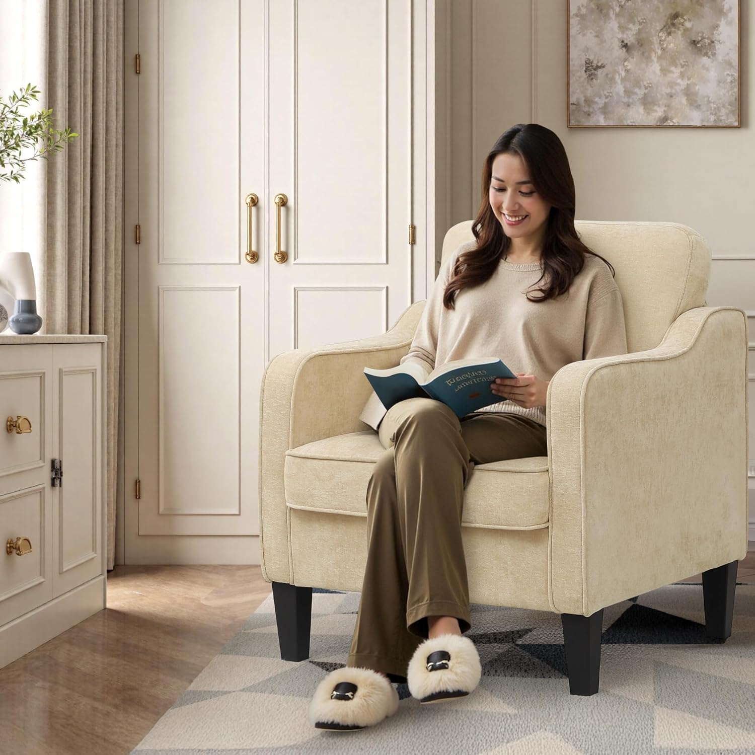 - 【Comfortable Seating】The 5.7" thick seat of this living room chair are padded with high-density foam for superior comfort. The armchair with 115° seating angle offers enhanced support, reduces lumbar fatigue and ensures a comfortable seating experience. The armrests are perfectly aligned with your arms, providing your hands with plenty of support for long hours of reading, resting or relaxing.
