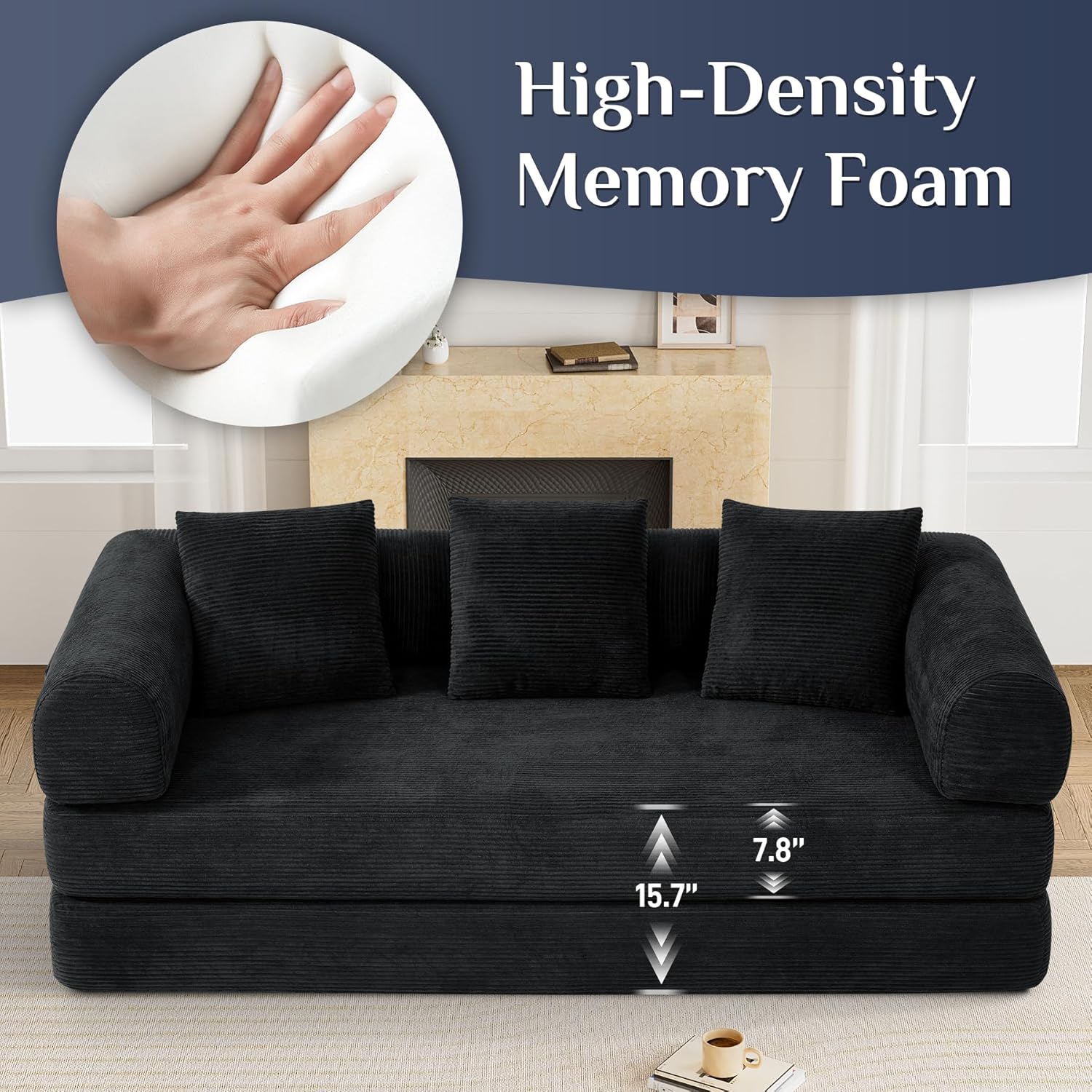 Convertible Sleeper Sofa Bed with Pillow, 4-in-1 Corduroy Folding Mattress Couch with Fixed-Shape Frame, Futon Fold Out Floor Sofa Cama Lounge Couch for Living Room Bedroom Studio, Black