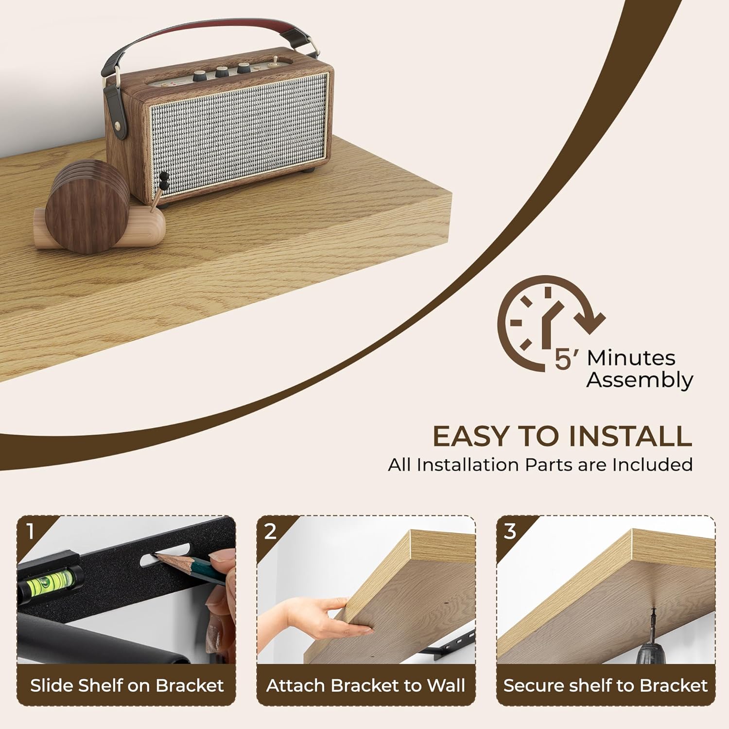 - Easy To Assemble: This floating shelves not only come with stainless-steel galvanized invisible brackets, but also equipped a fixing screw at the bottom to fix the shelf on the support rod, which solves the problem of sliding and is not easy to damage, and can be used for a long time. Instructions, magnetic level, drywall anchors, and screws included. This is great because you can easily mount these rustic shelves Gap-Free to any surface in less than 10 minutes
