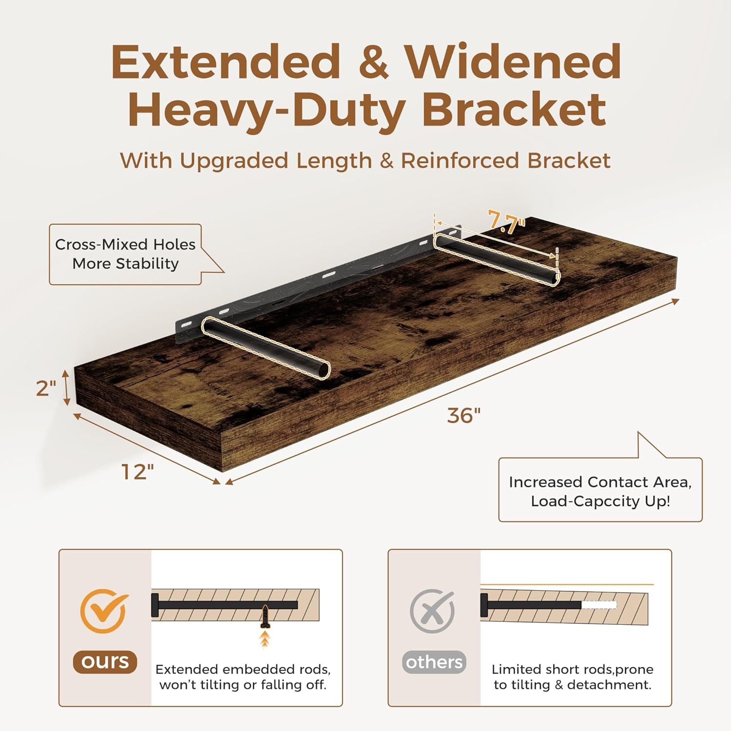 Floating Shelves 36 Inch Long, 12 Inch Deep Floating Shelves for Wall, 36 x 12 Shelves for Wall Storage & Display, 2" Thick Floating Shelf for Bathroom, Living Room, Rustic Brown Color, Set of 1