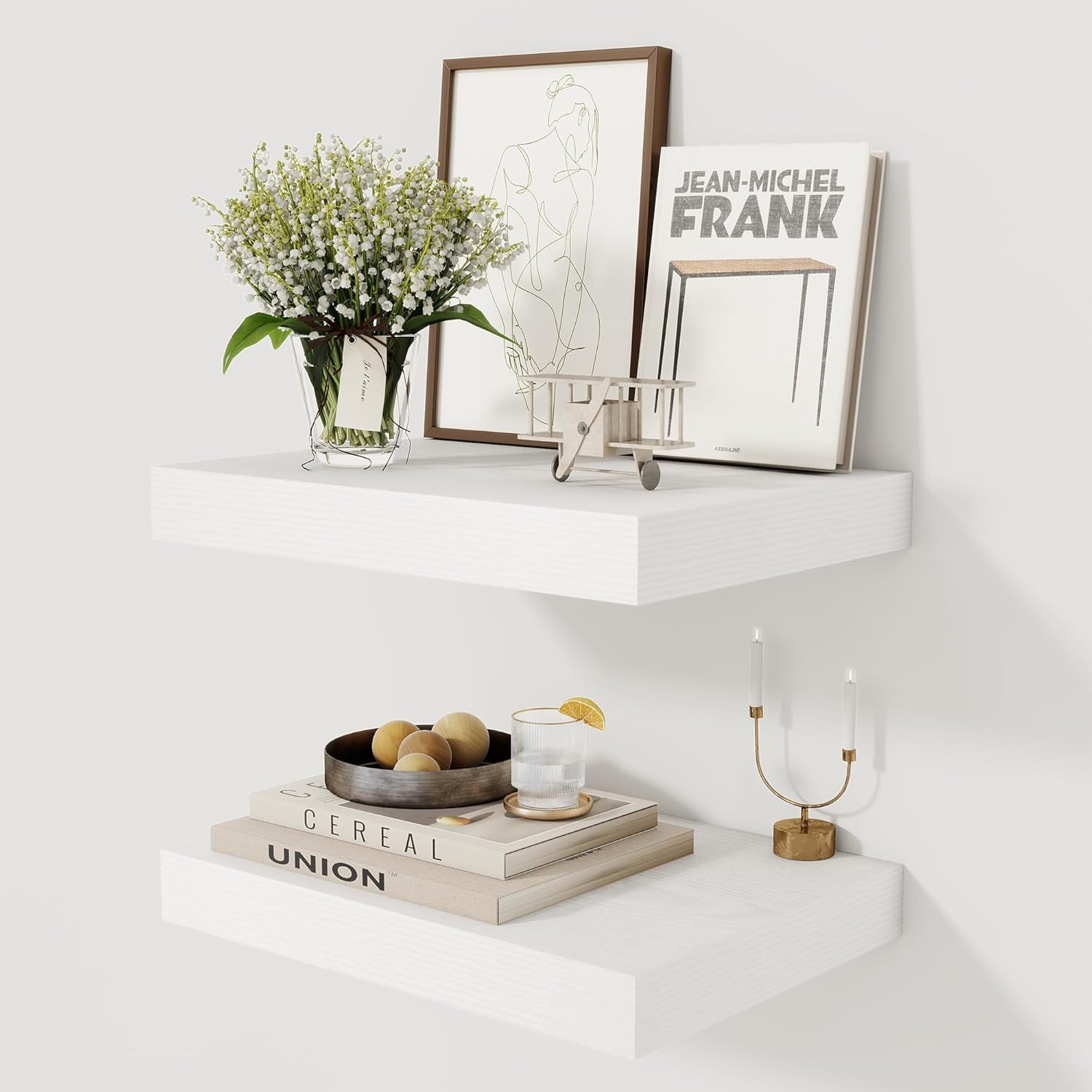 - 【DECORATIVE & FUNCTIONAL】The wall-mounted floating shelves are designed for decoration and storage, utilizing and decorating any space in your home. Used as shelf decor to show your collection, books, or prize, the hanging shelves are perfect for displaying your photo frame, small plants, model, or audio in your living room, office, study. And can also use as over the toilet storage shelf in the bathroom to hold toiletries or used as kitchen shelf to storage condiments.