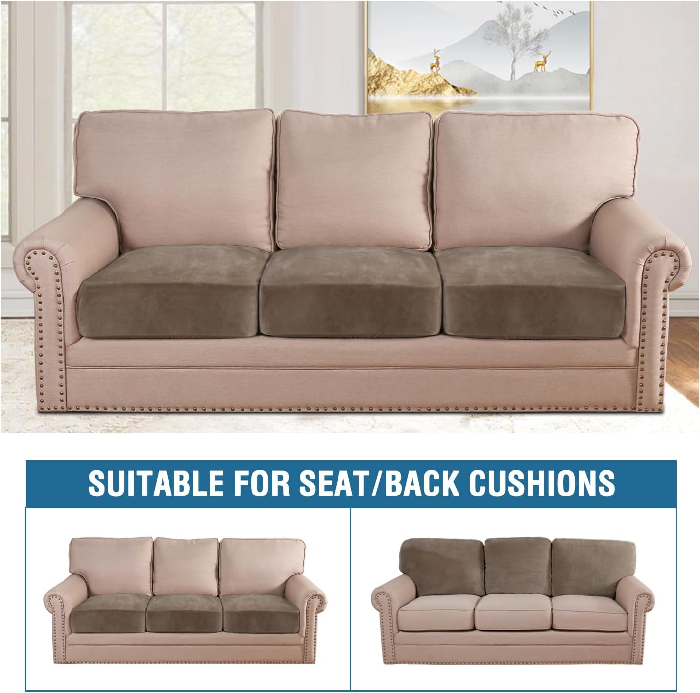 H.VERSAILTEX Velvet Stretch Couch Cushion Cover Plush Cushion Slipcover for Chair Loveseat Sofa Cushion Furniture Protector Seat Cushion Sofa Cover (3 Piece Sofa Cushion Covers, Mocha)