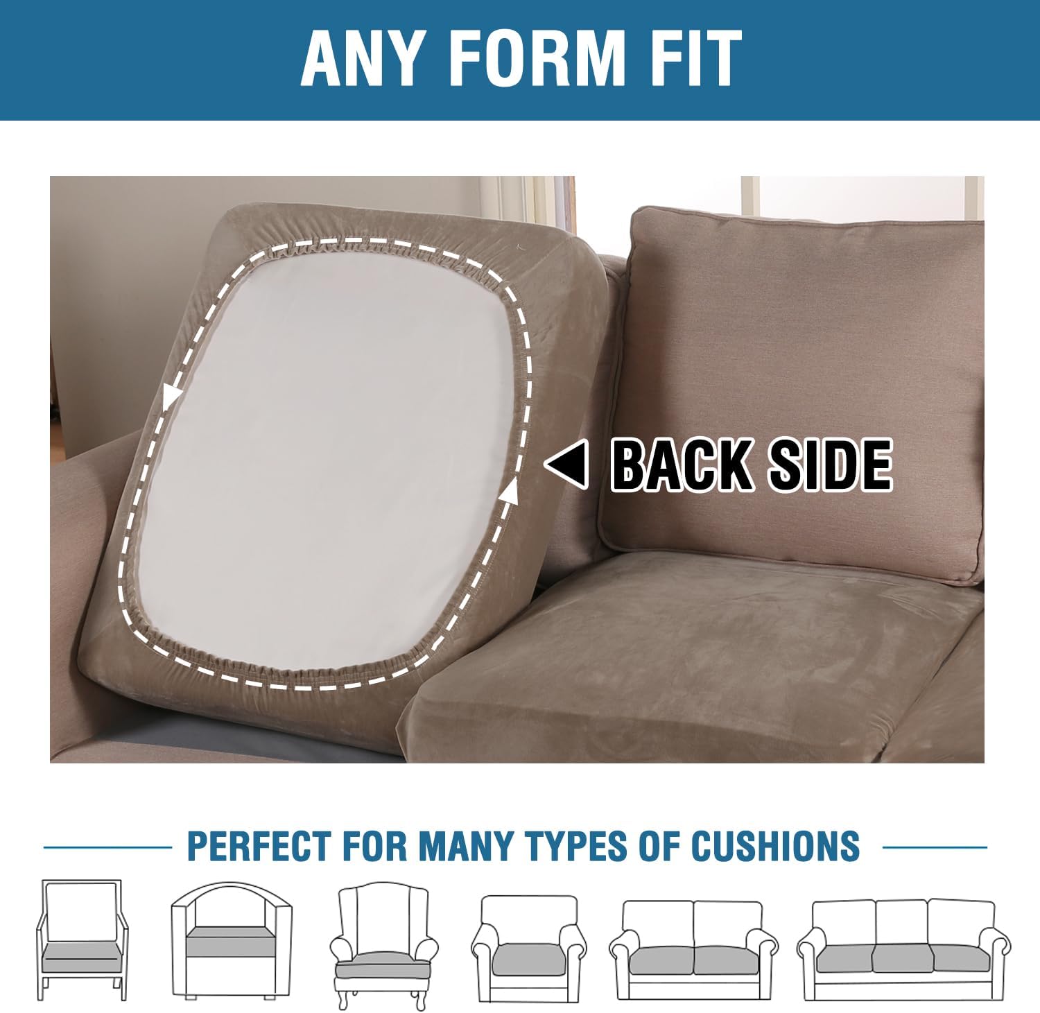 - ANY FORM FIT: Each cushion cover measures: 19.6-29.5" length, 21.6-30.5" width and 2-10" height. It's crafted from a unique extra stretchy fabric, perfect for regular square cushions, T-cushions and also L-cushions, used to cover not only the seat cushions of your sofa, but also the back cushions as long as they can be separated from the sofa