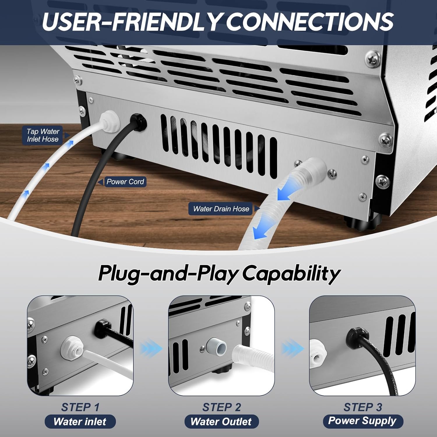 - Easy Installation & Operation - This ice maker comes with all necessary accessories, including a water inlet hose, drain hose, quick connector, and ice shovel. Simply connect the hoses, and the machine will automatically fill and drain, starting the ice-making cycle with ease.