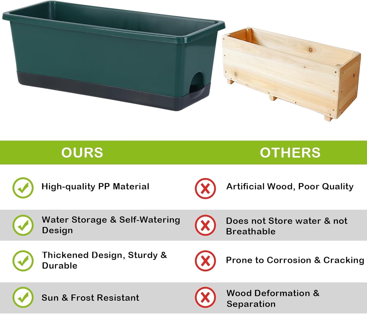 - 【Premium & Durable】The planter pots are made of high quality PP material and has been thickened to bear up to 300KG (660LB). This window box planter is sturdy, wear-resistant and durable. It can be exposed to light, wind, and sunlight for long periods of time, with a lifespan of decades. It is an excellent planter box for both indoor and outdoor.