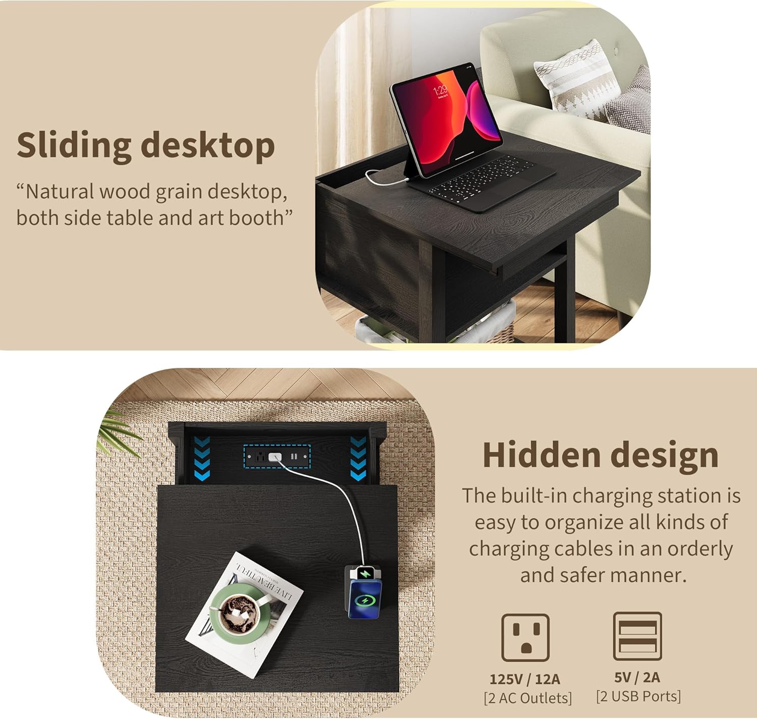 Rresyet Sliding Side Table with Charging Station & 2-Tier Storage,Farmhouse End Table, Wooden Nightstand for Bedroom & Living Room,Black