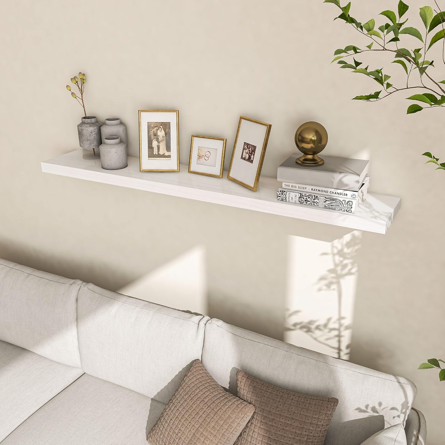 - Extra Deeper & Thicker for Storage - Each board measures 48"W x 8"D x 1.4"H. Extra deeper and thicker design in order to bring maximizes storage space and weight capacity, even hold up to 60 lb. This floating shelf taking up zero square feet, reduces clutter and highlights décor in compact spaces. It can help make full use of the empty wall, making it much more space-saving and making your room look larger and tidier.