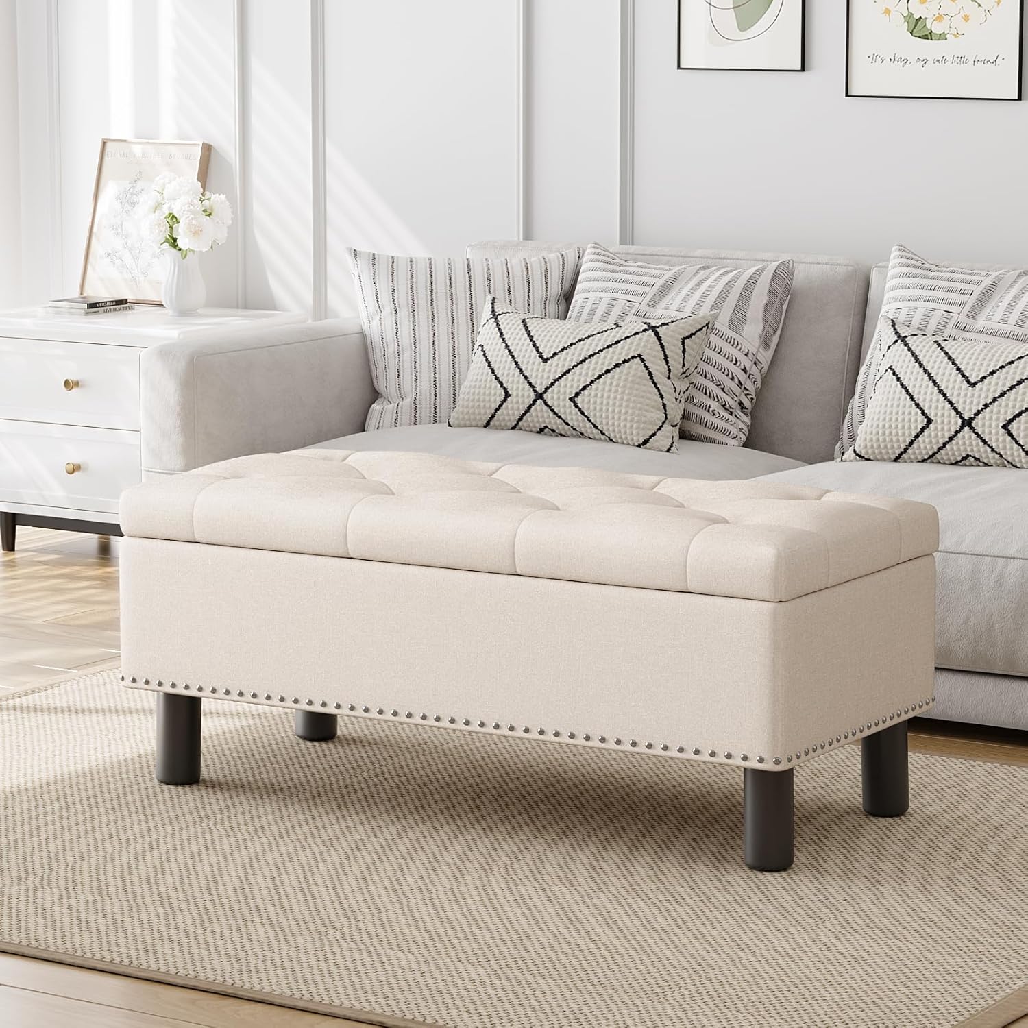 Furniliving 42” Ottoman Bench with Storage, Folding Storage Ottoman Benches with Wood Legs, Upholstered Bedroom Bench with Button-Tufted, Entryway Bench for Bedroom, Linen, Beige