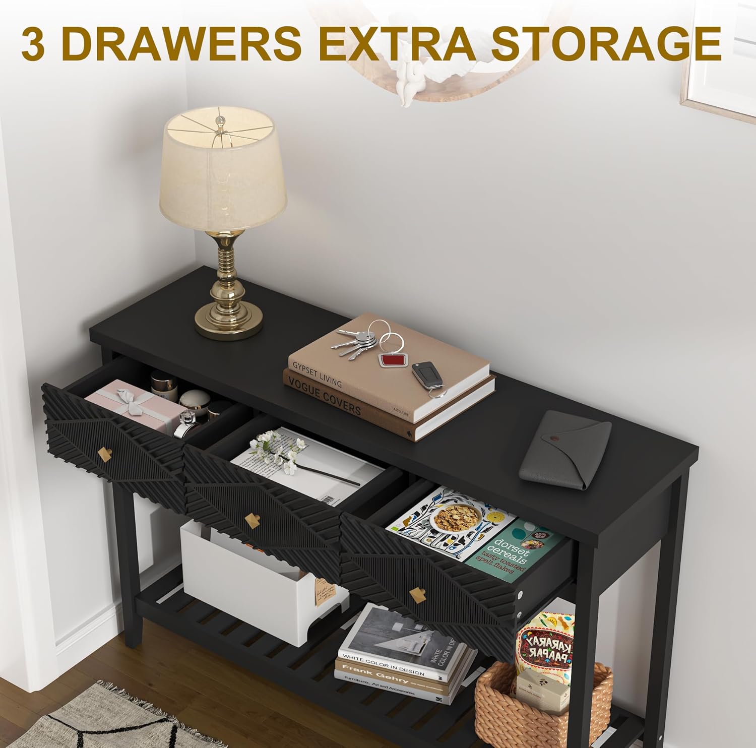 - Multi-Level Storage Space: This entry console table offers a sophisticated blend of functionality and style with its tabletop surface perfect for display or everyday use, complemented by 3 spacious drawers that elegantly conceal clutter. Additionally, the open storage shelf beneath provides easy access to frequently used items, creating an organized and visually appealing space in your living room, foyer, or hallway