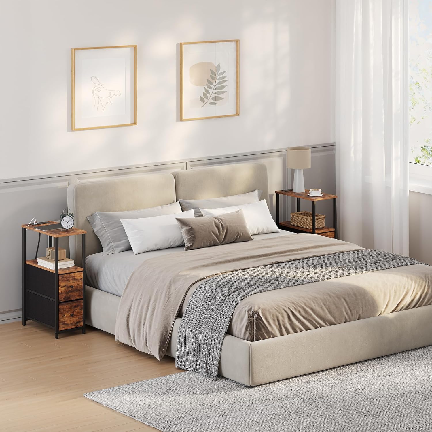 TUTOTAK Small Narrow End Table with Charging Station, Side Table with Outlets, Nightstand with 2 Cloth Drawers, Couch Table, for Living Room, Bedroom, Bedside, Brown TB01BB085