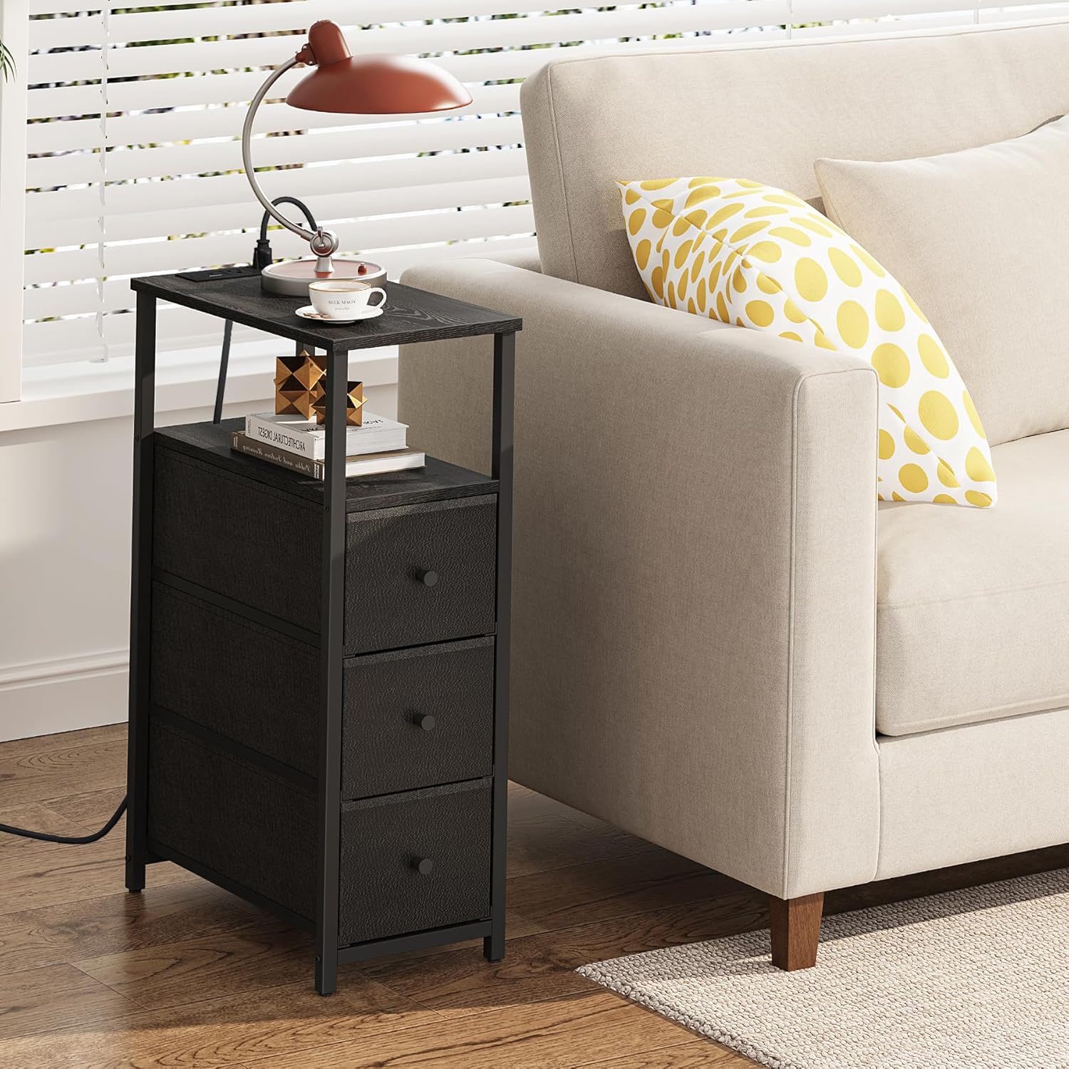 TUTOTAK Narrow Night Stand with Charging Station, Slim End Table with Plugins, Tall Side Table with 3 Fabric Drawer, Small Bedside Table with Storage, Living Room, Bedroom, Black TB01BK086