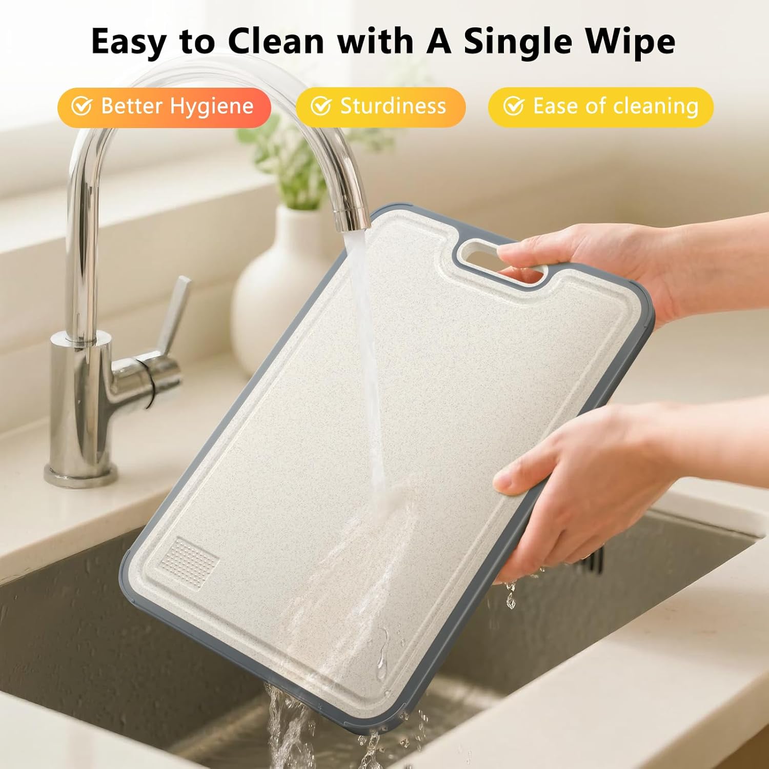 - Easy To Clean And Dishwasher Safe – The titanium and wheat straw cutting board is dishwasher safe to make everyday cleanups quick and simple. Our titanium chopping board is designed with a handle to make it easy to carry while offering more control