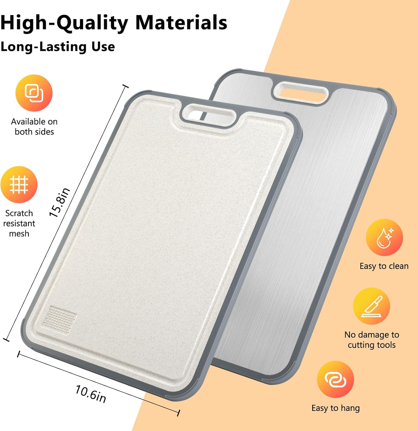 - Double Sided Cutting Board – Our large cutting board combines a double sided design and quality materials to bring you a Pure Titanium and Wheat Straw cutting board that provides the perfect fit for day-to-day meal prep in any kitchen without absorbing odors