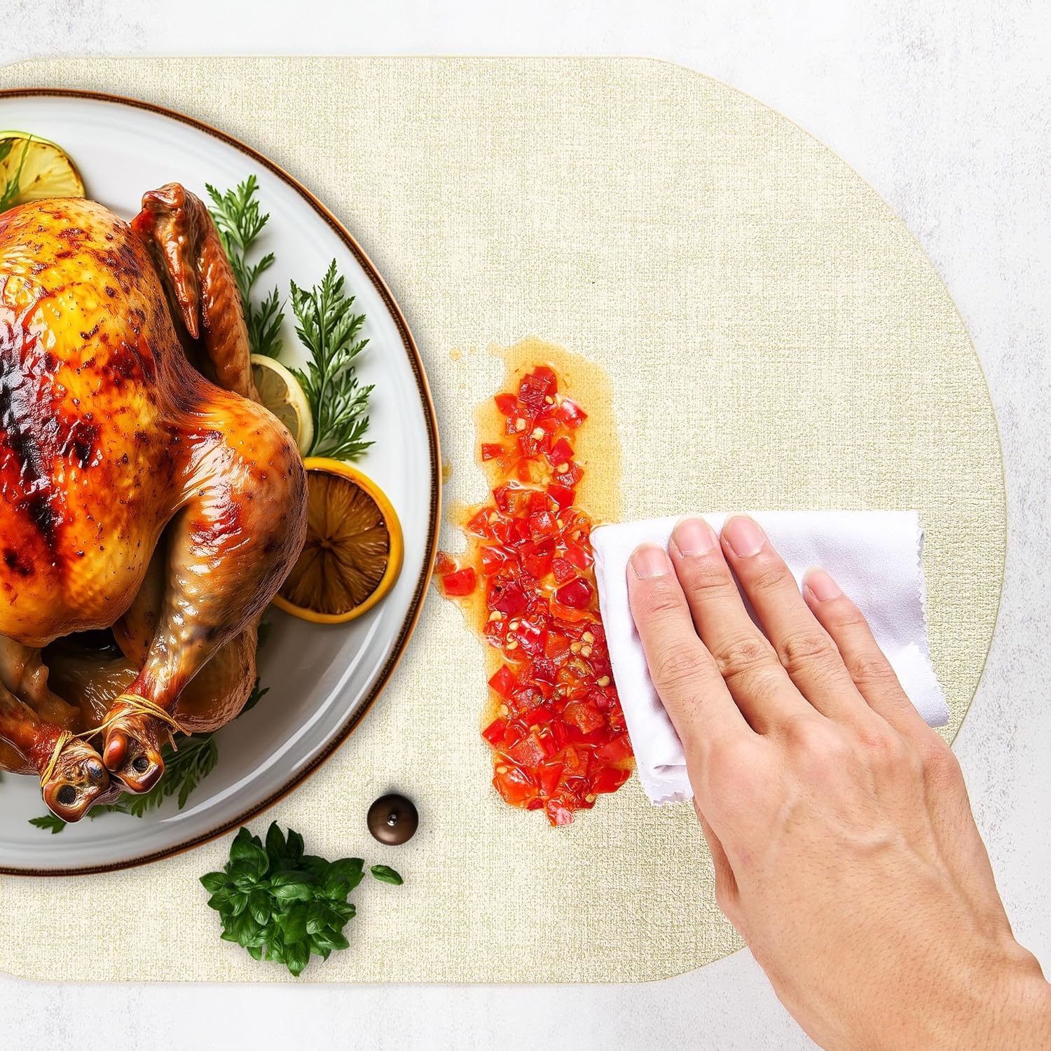 - 【Reversible & Non-slip Design】Say goodbye to slipping placemats. The subtly textured, double-sided surface resists wear, stays in place, and helps reduce noise for a quieter, more sophisticated dining experience. The tasteful colors and elegant oval shape add charm to any table—perfect for modern, farmhouse decor or light luxury interiors.