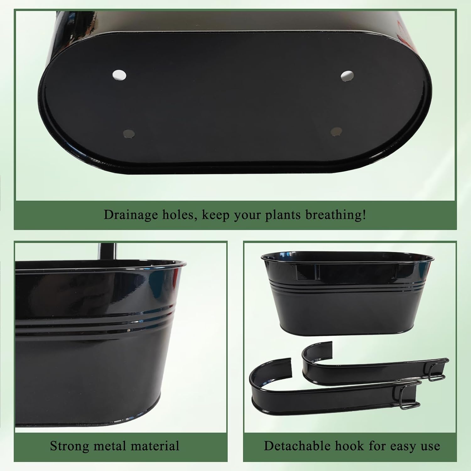- Detachable Hook & Drainage Hole: The removable hook makes it easy to hang on deck railings, fences, or windows. The drainage hole prevents overwatering, keeping plants healthy. Great for patio planters, herb gardens, or succulents—indoors or outdoors