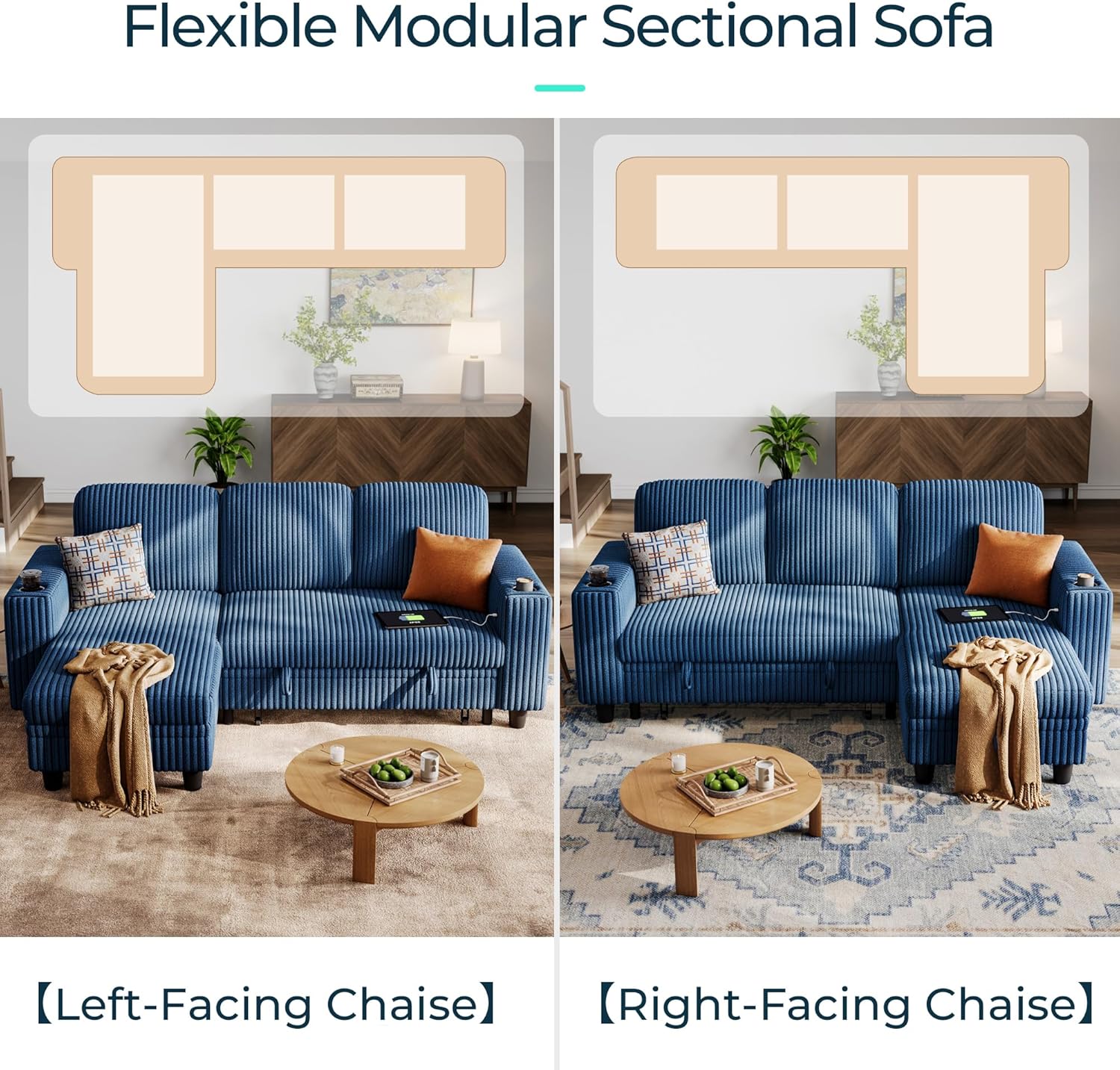 LINSY HOME Sectional Sleeper Sofa with Pull Out Couch Bed - Convertible Plush Corduroy Cloud Couch with Storage Chaise & USB Charging, Comfy L Shaped Modular Couches for Living Room Apartment, Blue