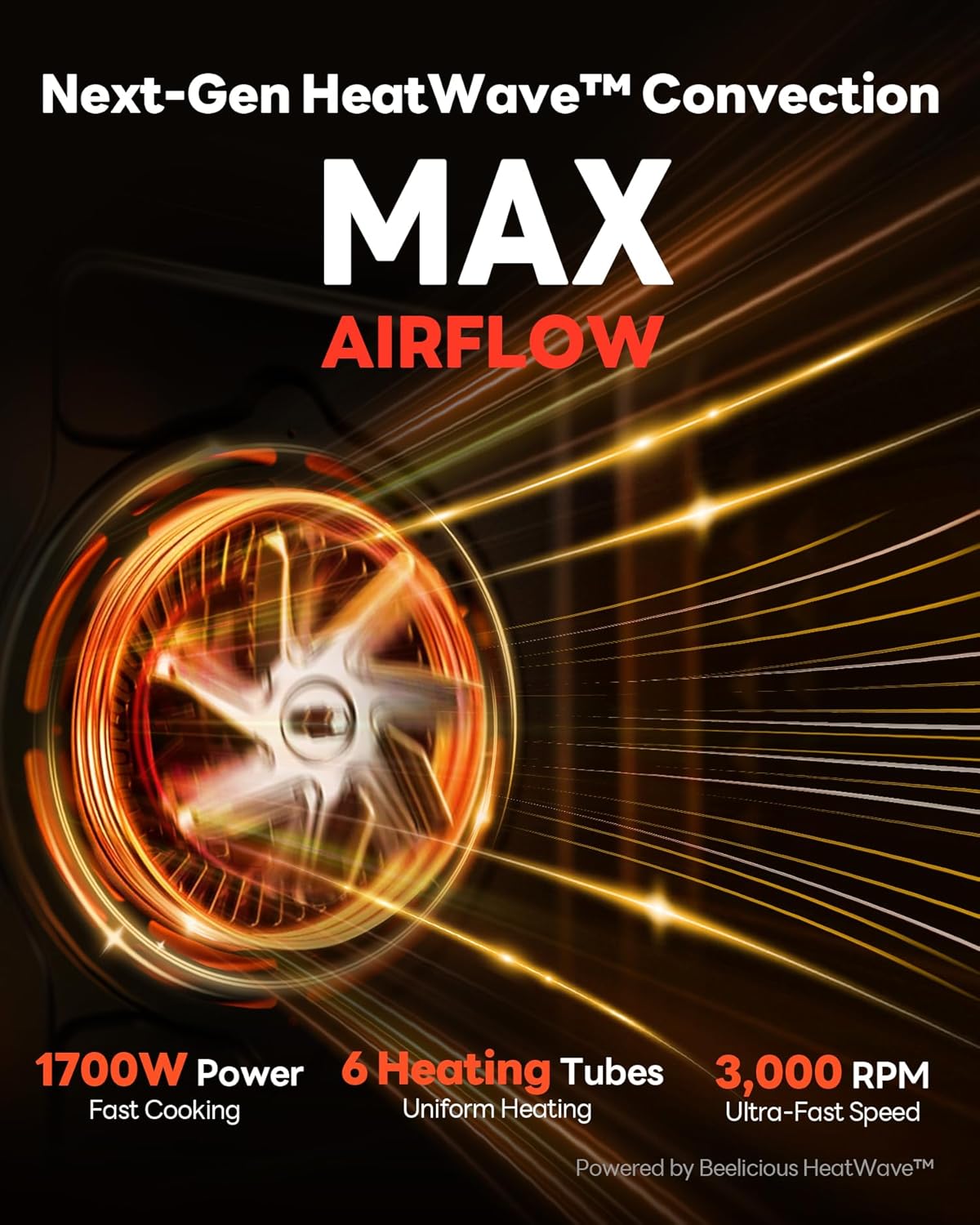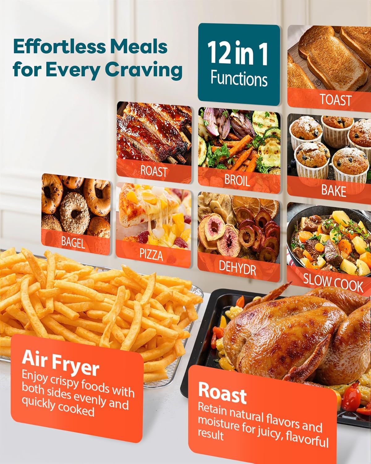 - 𝐎𝐍𝐄 𝐎𝐕𝐄𝐍, 𝟏𝟐 𝐖𝐀𝐘𝐒 𝐓𝐎 𝐂𝐎𝐎𝐊: No more juggling multiple appliances. Belicious Pro air fryer oven replaces multiple gadgets with 12 one-touch functions, Air Fry, Toast, Bake, Broil, Roast, Reheat, Warm, Slow Cook, Preheat, Rotate, and Dehydrate. From snacks to full dinners, it handles it fast and easy while saving time, space, and cleanup.