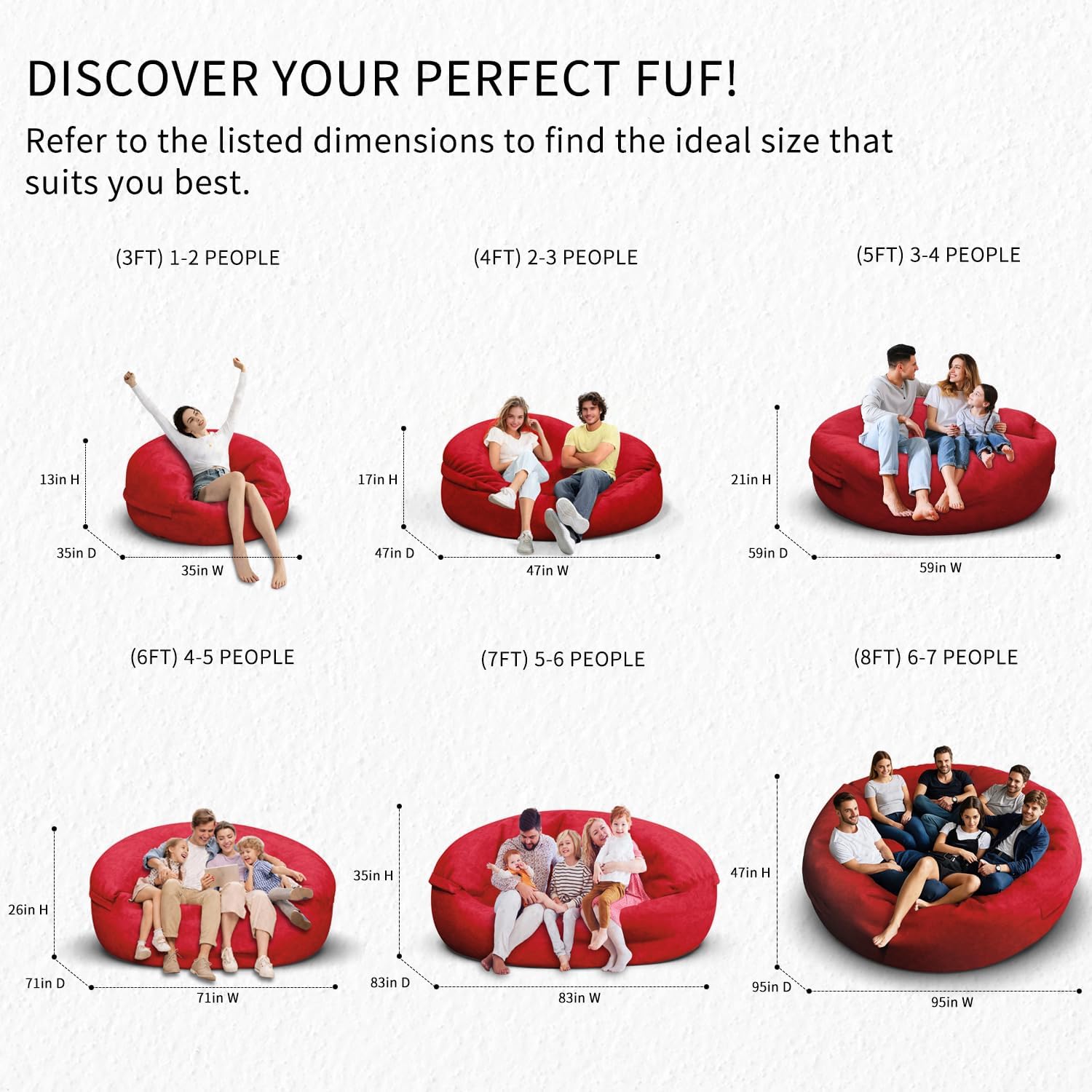 - 【Choose The Perfect Size for Your Space】 Our Bean Bag Sofa Covers Are Available In Six Sizes, From 3ft To 8ft, Catering To Both Kids And Adults.The 3ft (Capacity: 1-2 People),4ft (Capacity: 2-3 People),5ft (Capacity: 3-4 People),6ft (Capacity: 4-5 People),7ft (Capacity:5-6 People),And 8ft (Capacity:6-66 People) Options Ensure You Find The Ideal Fit.Each Size Adds A Stylish Touch To Any Space,Making Them A Versatile Addition To Your Home.