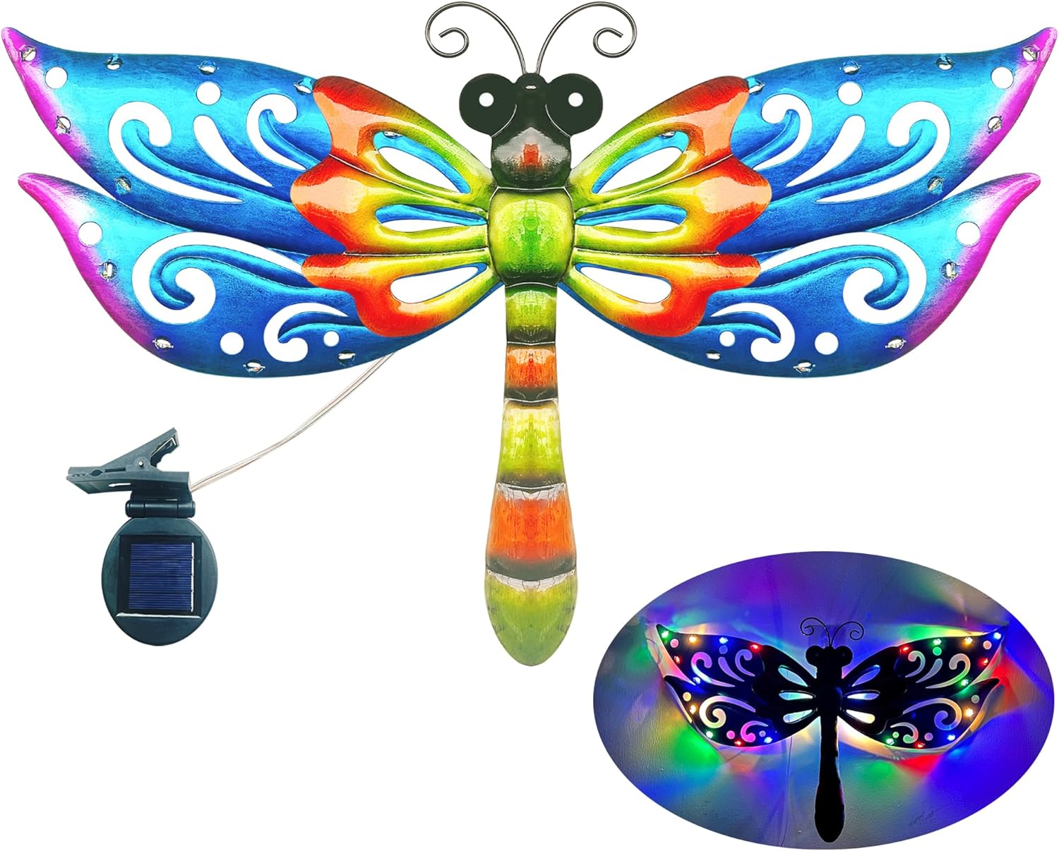 Solar Dragonfly Wall Art, 12-Inch Metal Garden Decor, Color Changing LED Lights, Multicolor