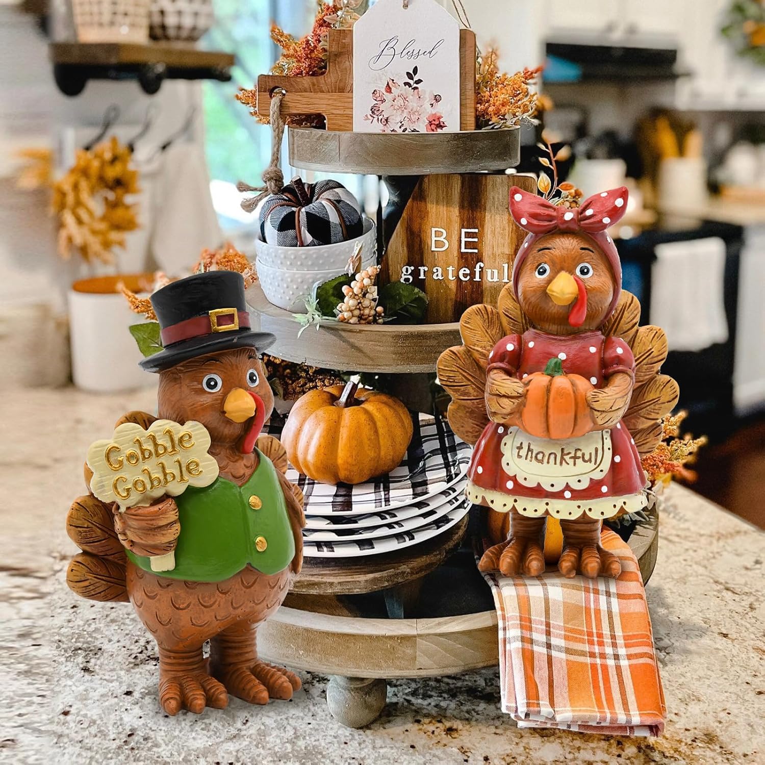 - 【Resin Turkey Figurine】 This Thanksgiving decorations for home piece features a lovely turkey couple, embodying the spirit of harvest decor. Its durable resin construction ensures it lasts for many seasons to come.Ideal for fall indoor decor, porches decoration.
