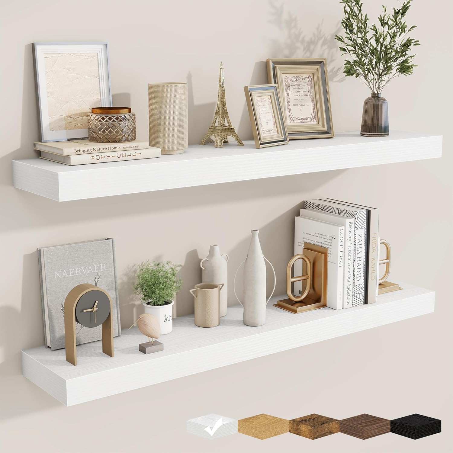 - Well-designed Floating Shelves: Our floating shelves for wall are made of premium engineered wood with a realistic wood grain finish. The rustic wood grain adds warmth and character to any modern or traditional interior. It can organize everyday clutter and make your space tidier, and make it full of aesthetic flare