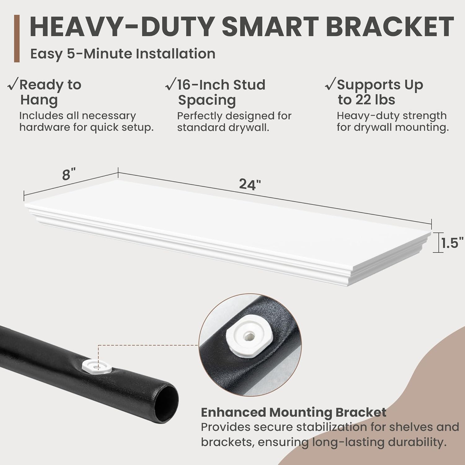 - Strong Suppoot: MDF wooden floating shelf with reinforced brackets supports heavy items effortlessly, holding up to 22 pounds. Hanging shelf's bracket has been preset with a 2° elevation to remain level and not sag after bearing heavy loads