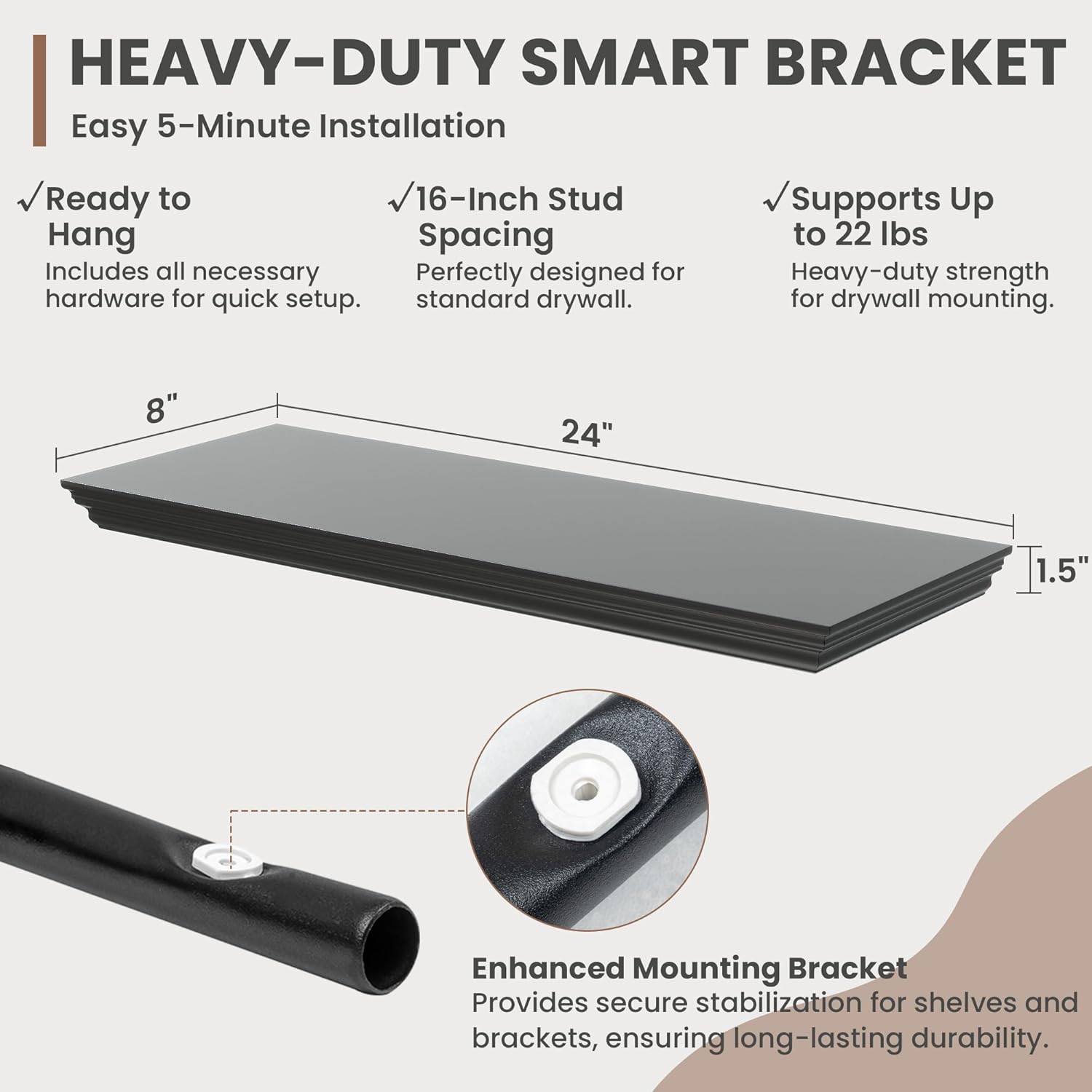 - Strong Suppoot: MDF wooden floating shelf with reinforced brackets supports heavy items effortlessly, holding up to 22 pounds. Hanging shelf's bracket has been preset with a 2° elevation to remain level and not sag after bearing heavy loads