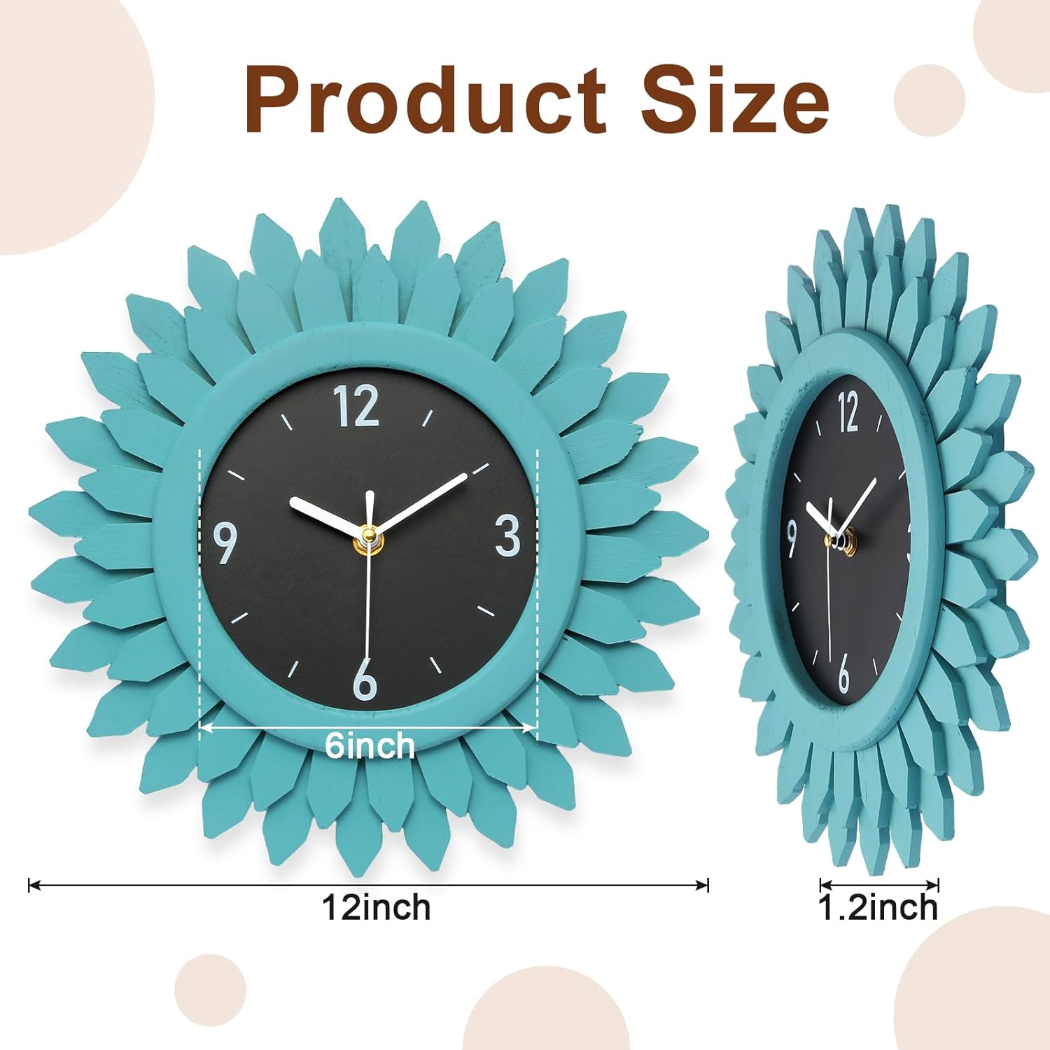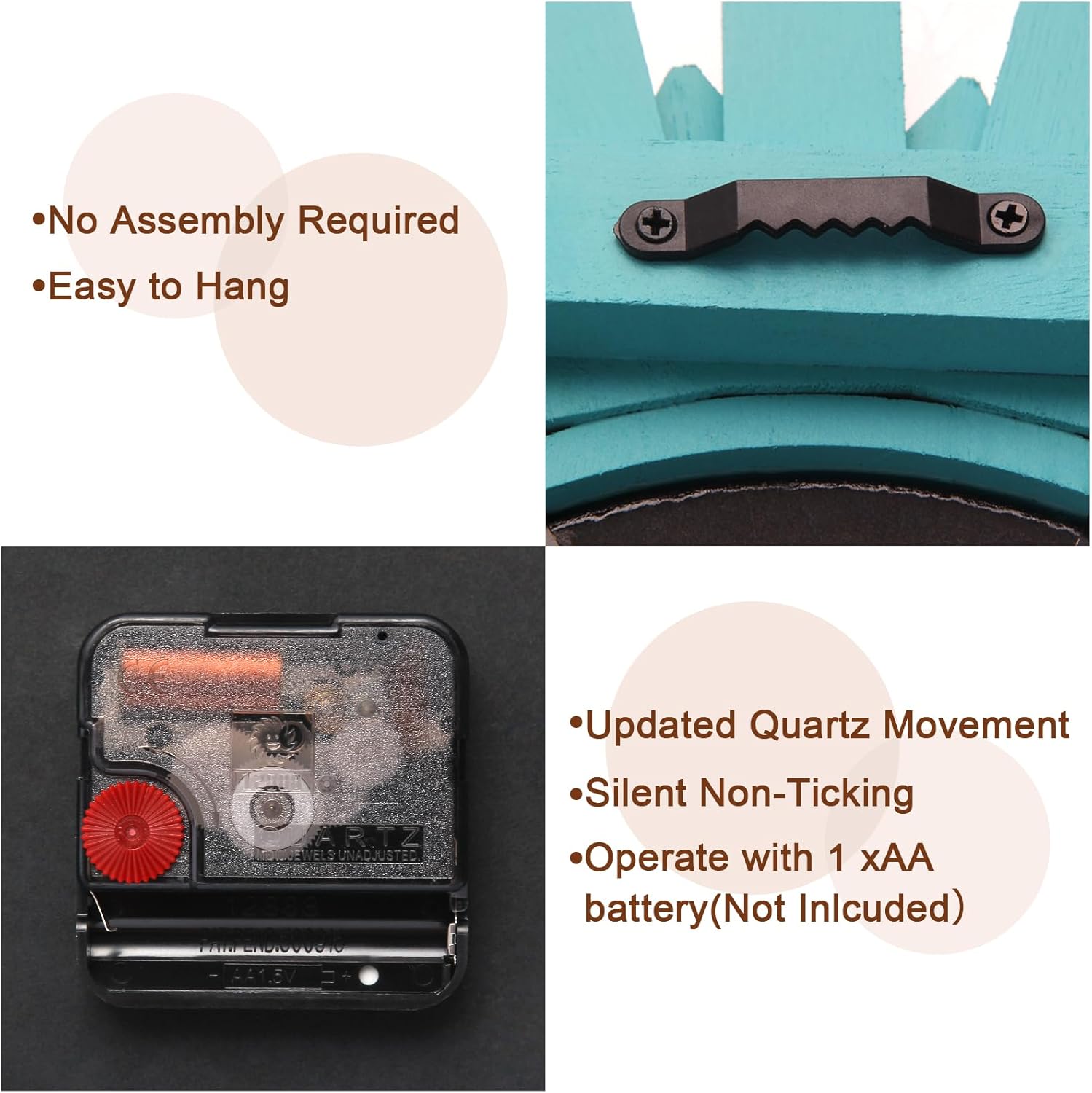 Honiway Wall Clock Battery Operated 12 Inch Rustic Wood Beach Sunburst Decorative Wall Clock Silent Non-Ticking Coastal Wall Decor Clocks for Living Room Kitchen Bathroom Bedroom (Cyan)