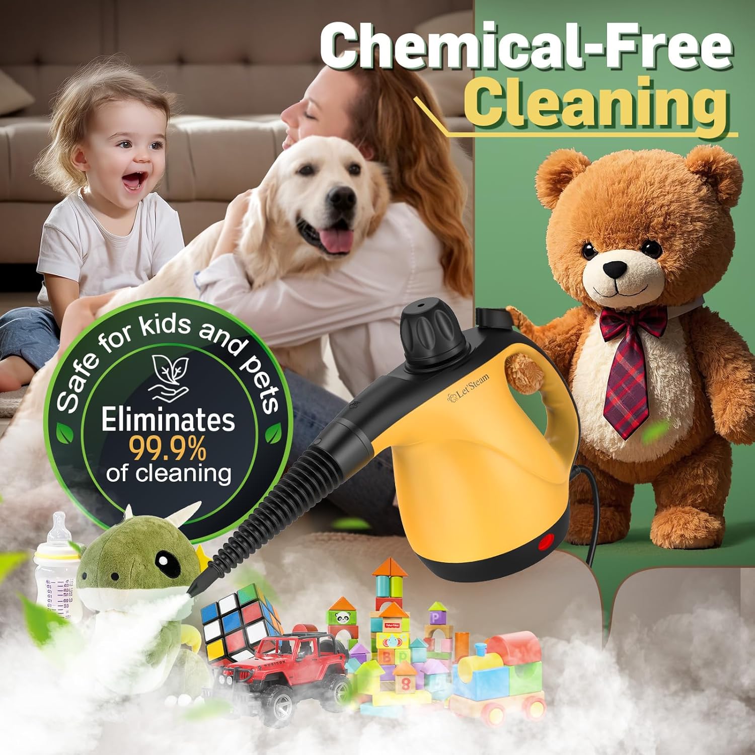 - 【All Natural & No Chemical Steam Cleaner】Experience natural cleaning with our steamer for cleaning! which produces steam by heating water added to the device. This hand held steamer is chemical-free, ensuring a safe and friendly environment for kids, pets, and elderly family members.