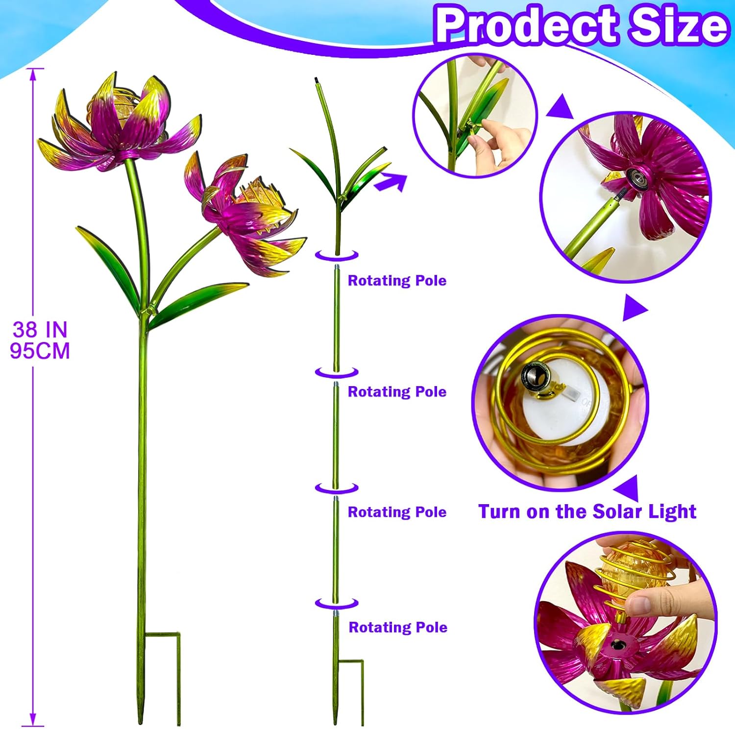 Solar Wind Spinner Outdoor, 63 Inch Metal Wind Spinner Yard Art with Lights - Twin Flower Design Pinwheels for Yard and Garden Decor, Solar Garden Decor