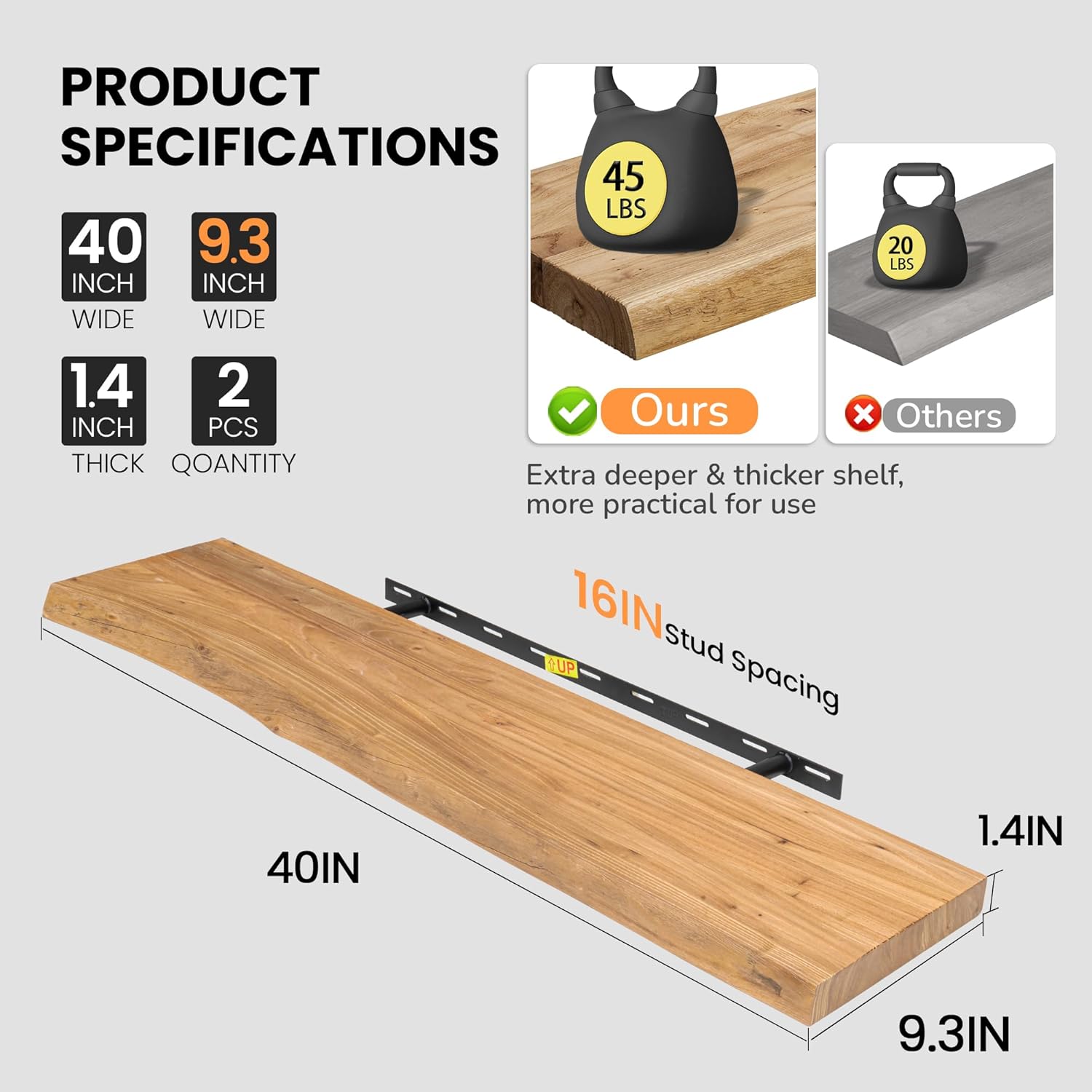 - 9.3" DEEP SOLID ELM WOOD: Fun Memories live-edge floating shelves are handcrafted from reclaimed elm wood and measure 40" x 9.3" x 1.4" each. Featuring natural grain, knots, and color variations, they add warmth and rustic charm to any space. Mount them vertically, side by side, or in corners for a clean, stylish look