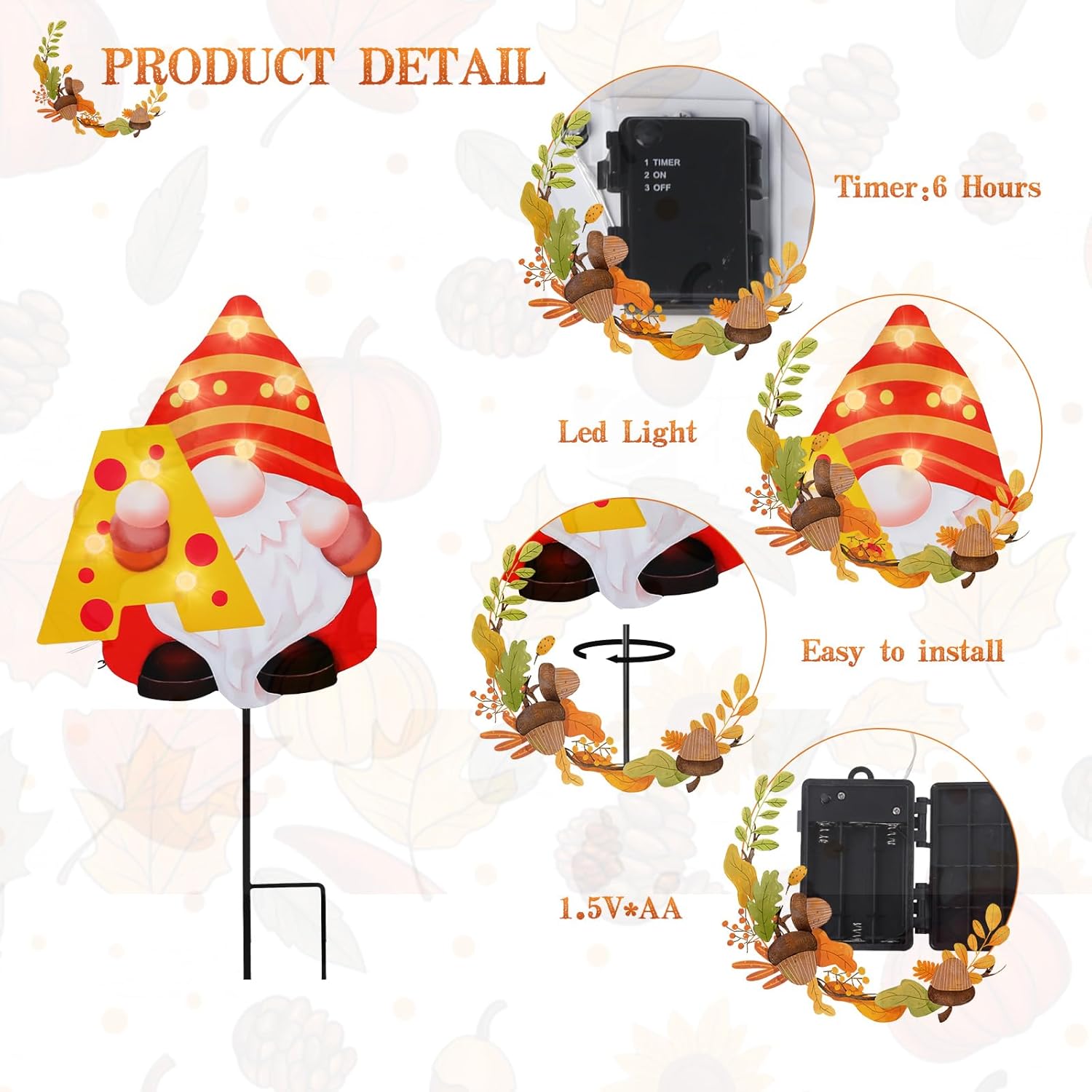 WONDER GARDEN Fall Yard Stakes Yard Signs, 4 Pack Metal Thanksgiving Lighted Garden Stakes, Gnome Sign with LED Lights for Harvest,Outdoor, Lawn,Farmhouse Decorations