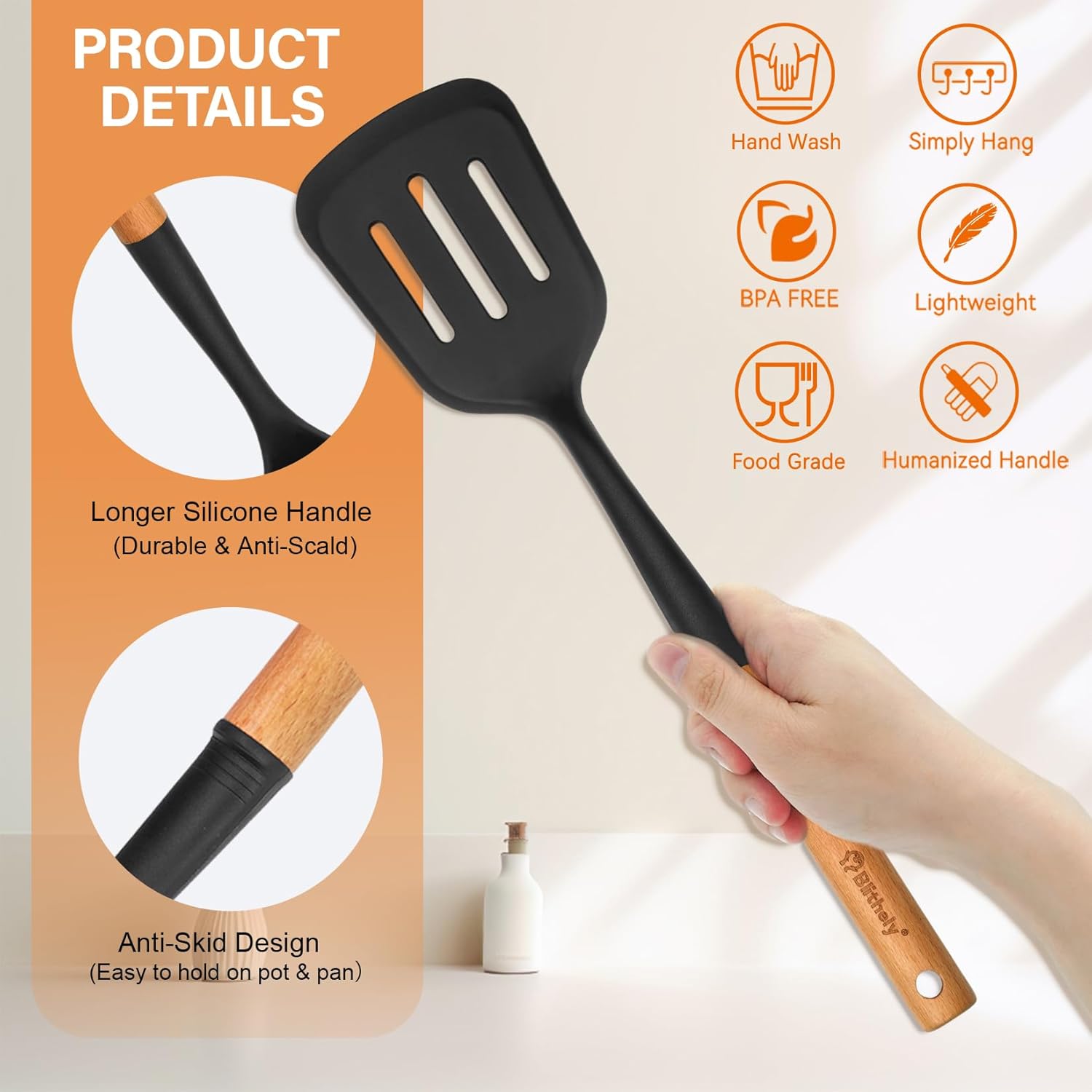 - 👨🍳【Ergonomic Long Wooden Handle】The Silicone Utensil Set comes with wooden handles provide a secure, slip-resistant grip, reducing hand fatigue during prolonged cooking. Engineered to block heat transfer, they stay cool even when flipping searing meats or stirring boiling soups. The natural wood grain adds a rustic aesthetic to modern kitchens, complementing minimalist or farmhouse-style decor.