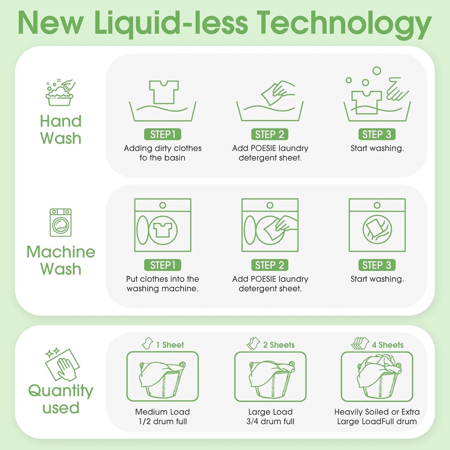 - Easy to Use - Liquidless detergent sheets, 1 sheet for small or medium loads where clothes are not very dirty, 2 sheets for large loads and 4 sheets for extra large loads, no waste. Not too little and not too much to save resources. Lighter Volume and Better Dissolving - the product is concentrated into a small piece, but has more powerful energy. And it can dissolve in water immediately, leaving your clothes fresh, clean and comfortable