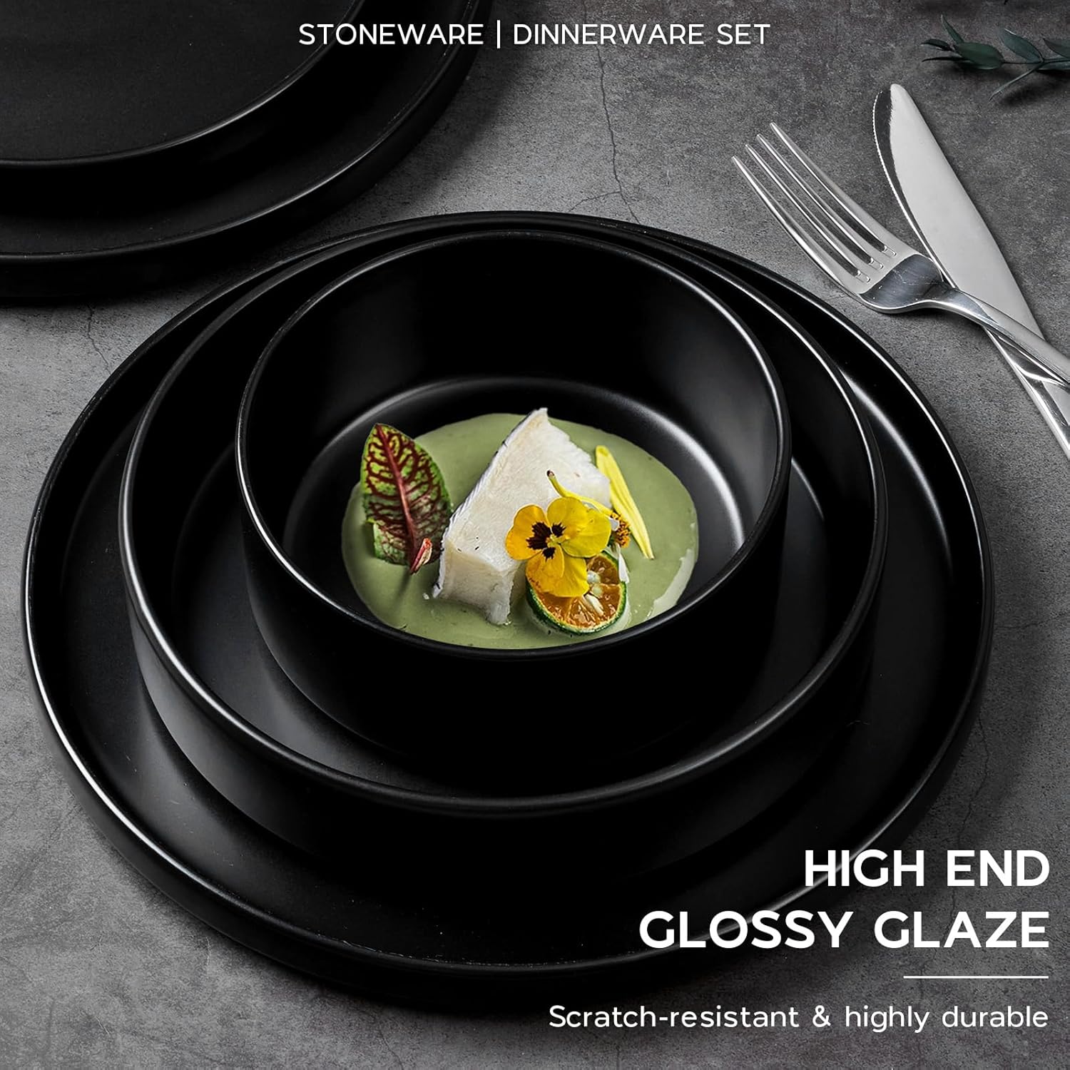 Onader 16 Piece Dinnerware Sets with Serving Bowls for 4, Stoneware Plates and Bowls Dish Sets, Ceramic Dinner Ware Dishware for Kitchen Dining, Chip & Scratch Resistant - Ebony Black