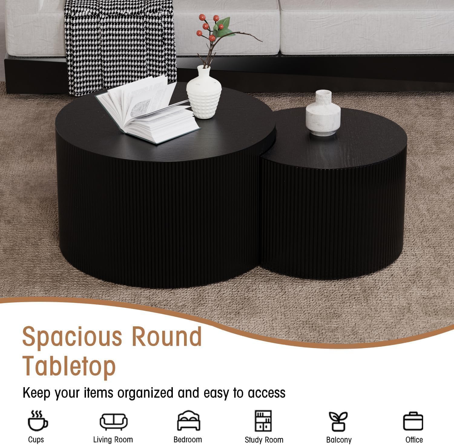 Round Nesting Coffee Table Wood Drum Nesting Tables Modern Stacking Coffee Table Set of 2 Fluted Center Table End Table for Living Room Home Office Small Spaces, No Assembling (Black Crescent)