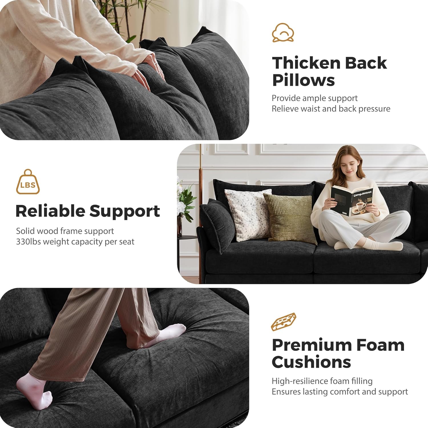 - 💡 Premium Chenille Fabric - The modern sofa is upholstered in premium chenille fabric that feels luxurious to the touch, offering both comfort and durability. The material is not only soft and inviting but also non-pilling and won't stain, ensuring long-lasting quality.