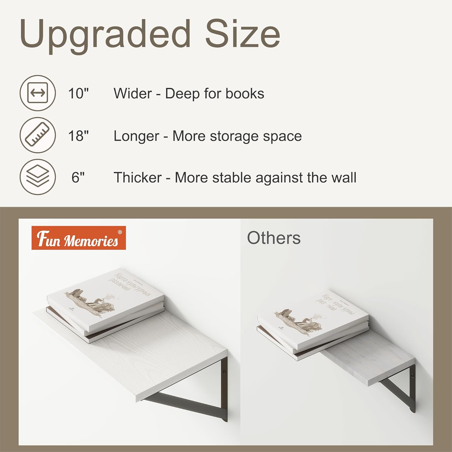 - 【10 INCH DEEP FLOATING SHELF】This extra deeper and wider wall shelves are 10 inches in depth and 18 inches in length instead of the regular narrow floating shelves, you can put photos, pictures, DVD players, videos, books, toys, and some other knickknack on this beautiful display wooden shelf.