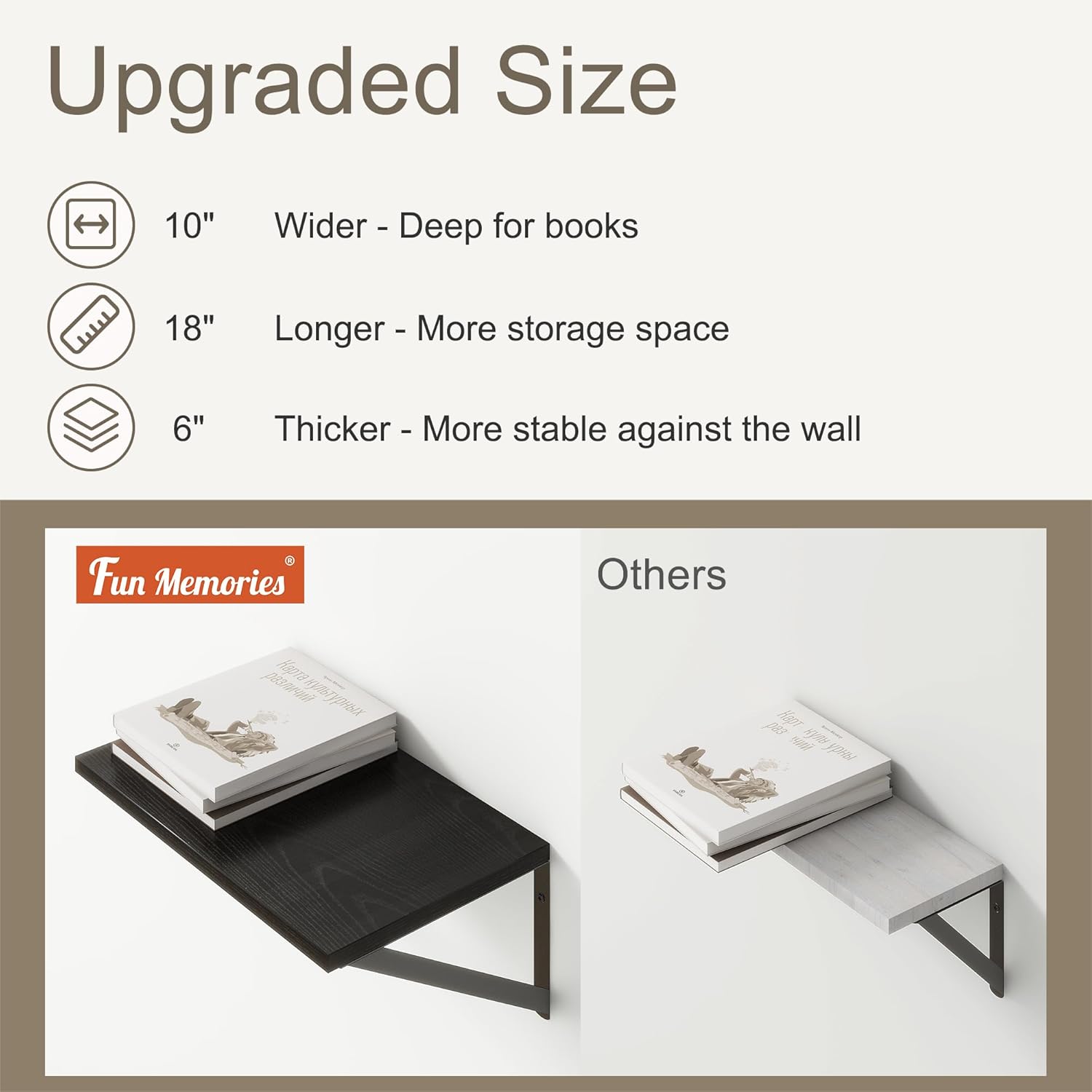 Fun Memories Black Floating Shelves 18 Inch Long, Rustic Floating Shelf with Brackets, 10 Inch Deep Wall Shelves, Black Bathroom Shelves, 18 x 10 Storage Shelf for Kitchen, Living Room, Set of 2