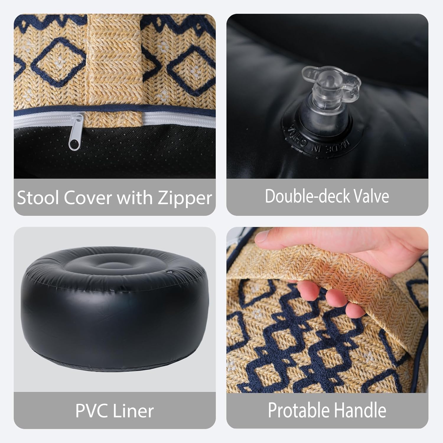Outdoor Inflatable Ottoman with Air Pump, Embroidery Patio Footrest Stool D21”x H9”, Round Pouf Ottoman with Portable Handle Suitable for Garden, Camping, Bedroom, Living Room