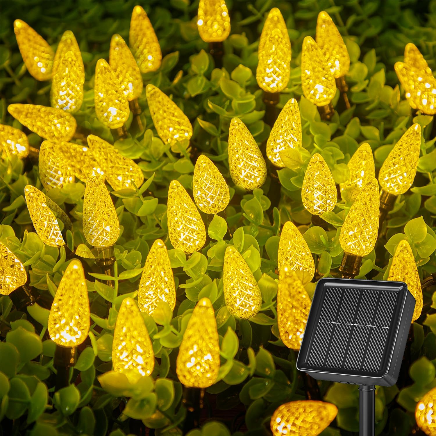 - [100LED Solar C6 Strawberry Christmas Lights] The 100 led C6 strawberry solar lights will bright up your Christmas, Halloween, Thanksgiving day and autumn holiday, bring magical and brightness to your home. Total length: 39ft, lead wire length: 6.56ft, space between LEDs: 4 inch