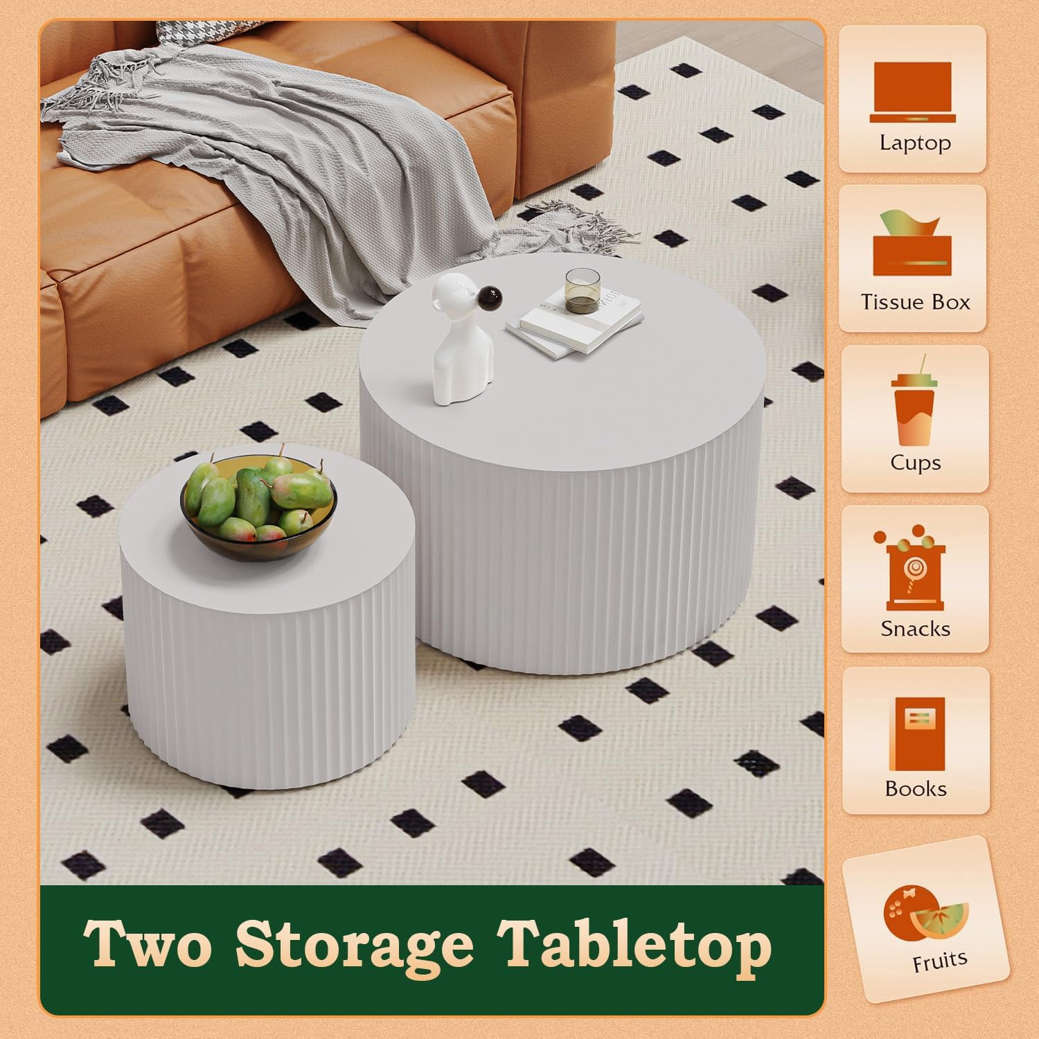 Round Nesting Coffee Table Modern Fluted Coffee Table Set of 2 Circle Drum Coffee Tables Small Round Accent Side End Table for Living Room No Assembly (White A 27in)