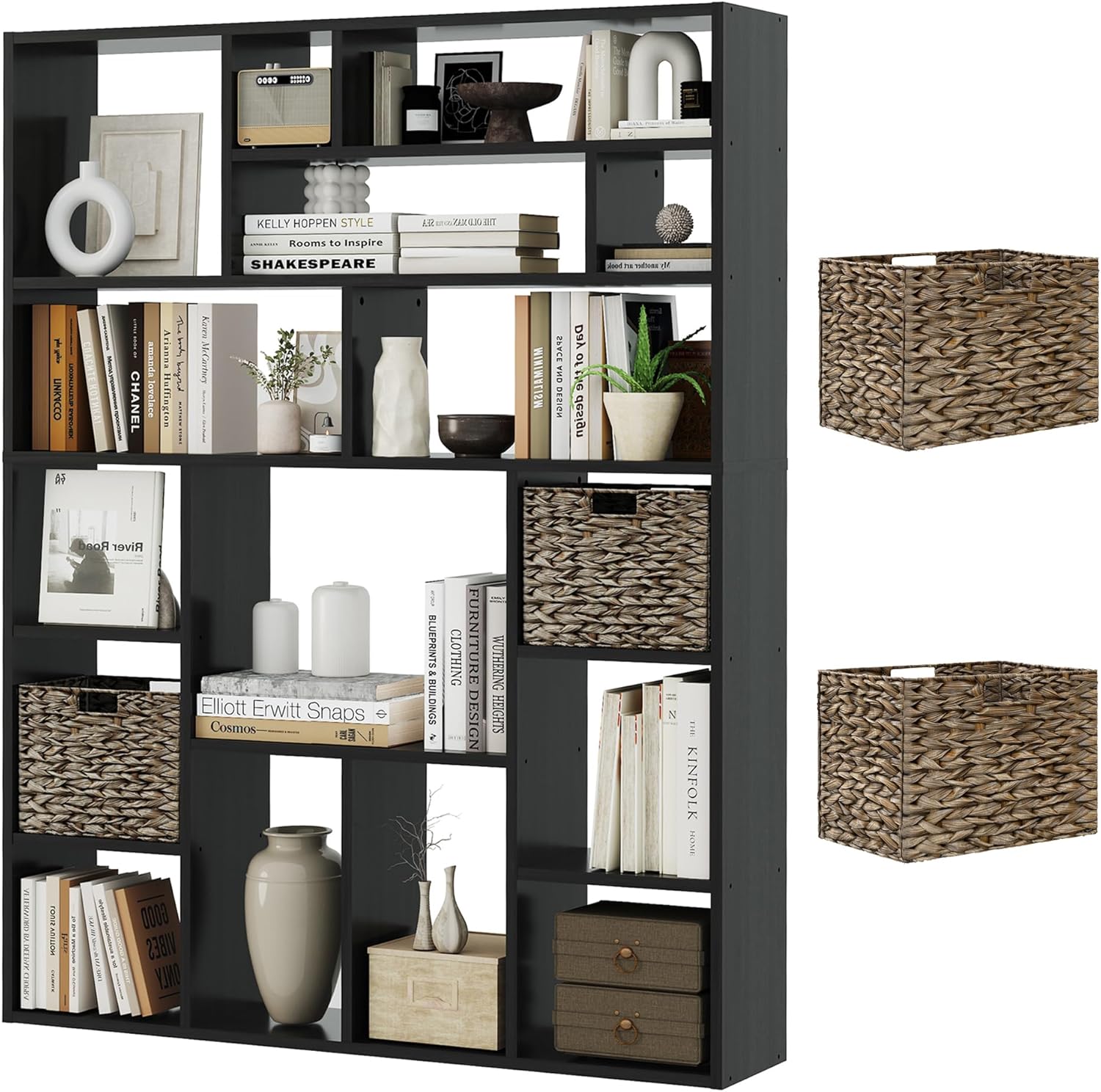 - Smart Storage Solution – The unique backless design with 16 irregularly arranged cubes (6 tiers total) offers versatile storage options, perfect for books, decor, and the included 2 premium foldable woven baskets that add both functionality and style.