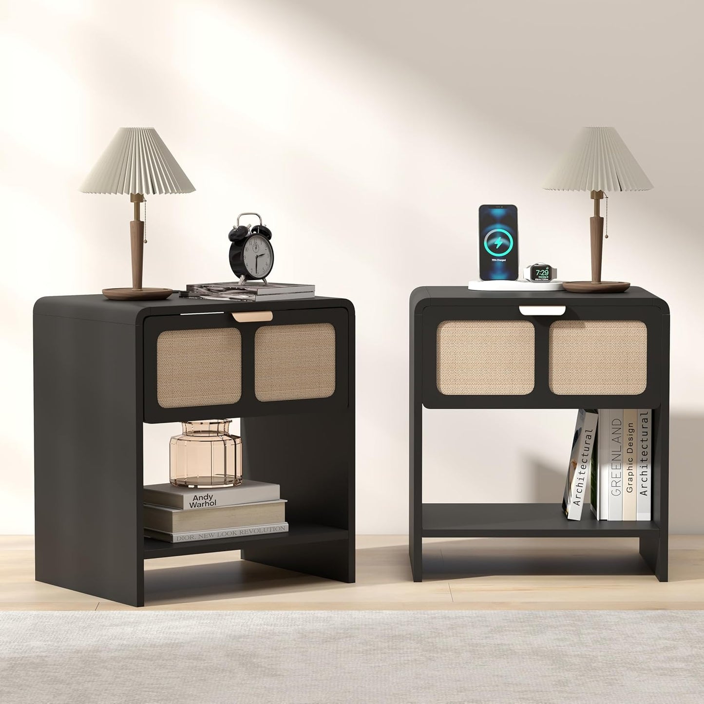 LEVNARY Nightstand Set of 2, Mid-Century Modern Bedside Table with Charging Station and Fabric-Like Textured Drawer, Wooden End Table for Farmhouse Bedroom Living Room (2, Black)