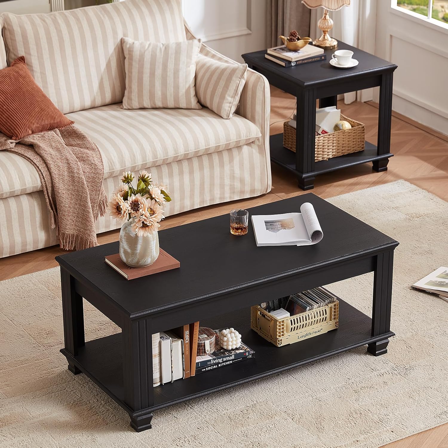 Farmhouse Coffee Tables for Living Room,Square Tea Table with Open Storage Shelf,Large Coffee Table,Rustic Wooden Center Table,Black