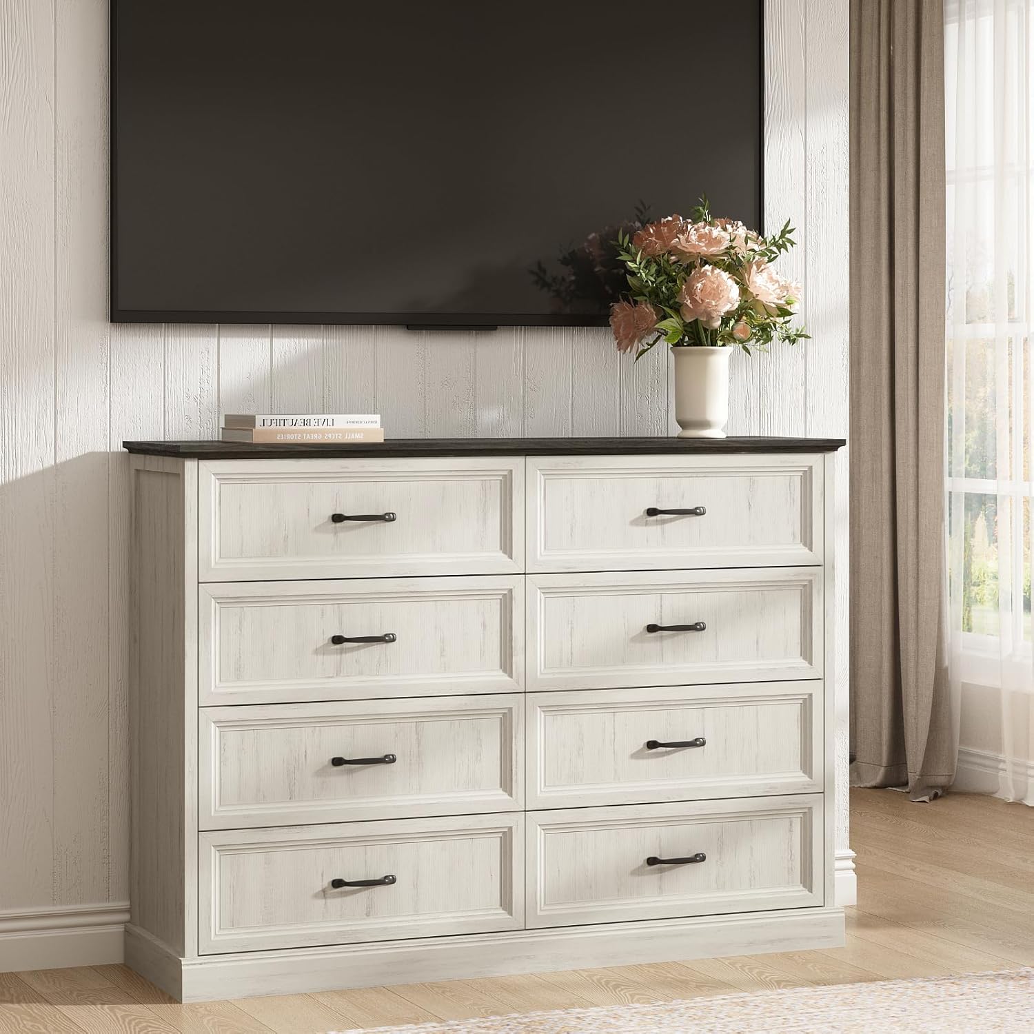 - Versatile Usage: This white dresser offers various placement options for your room. Beyond being a storage cabinet in the bedroom, it serves as a entryway dresser to put daily items and overflow, or even as a TV stand(suit for 60" TV) in the living room for odds and ends. The classic farmhouse dressers are suitable for most spaces and styles of homes, can be integrated into different scenes, such as bedroom, living room, closets, hallway, and entryway etc. The farmhouse dresser with drawers can fit them perfectly.