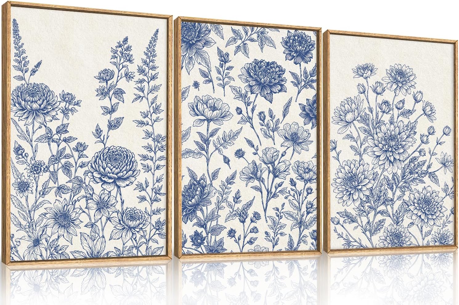 Classic Chinoiserie Floral Framed Canvas Wall Art Set, Blue and White Flower Wall Decor, Navy Watercolor Wall Painting, Minimalist Wildflower Art Print for Living Room, Bedroom - 16"x24"×3