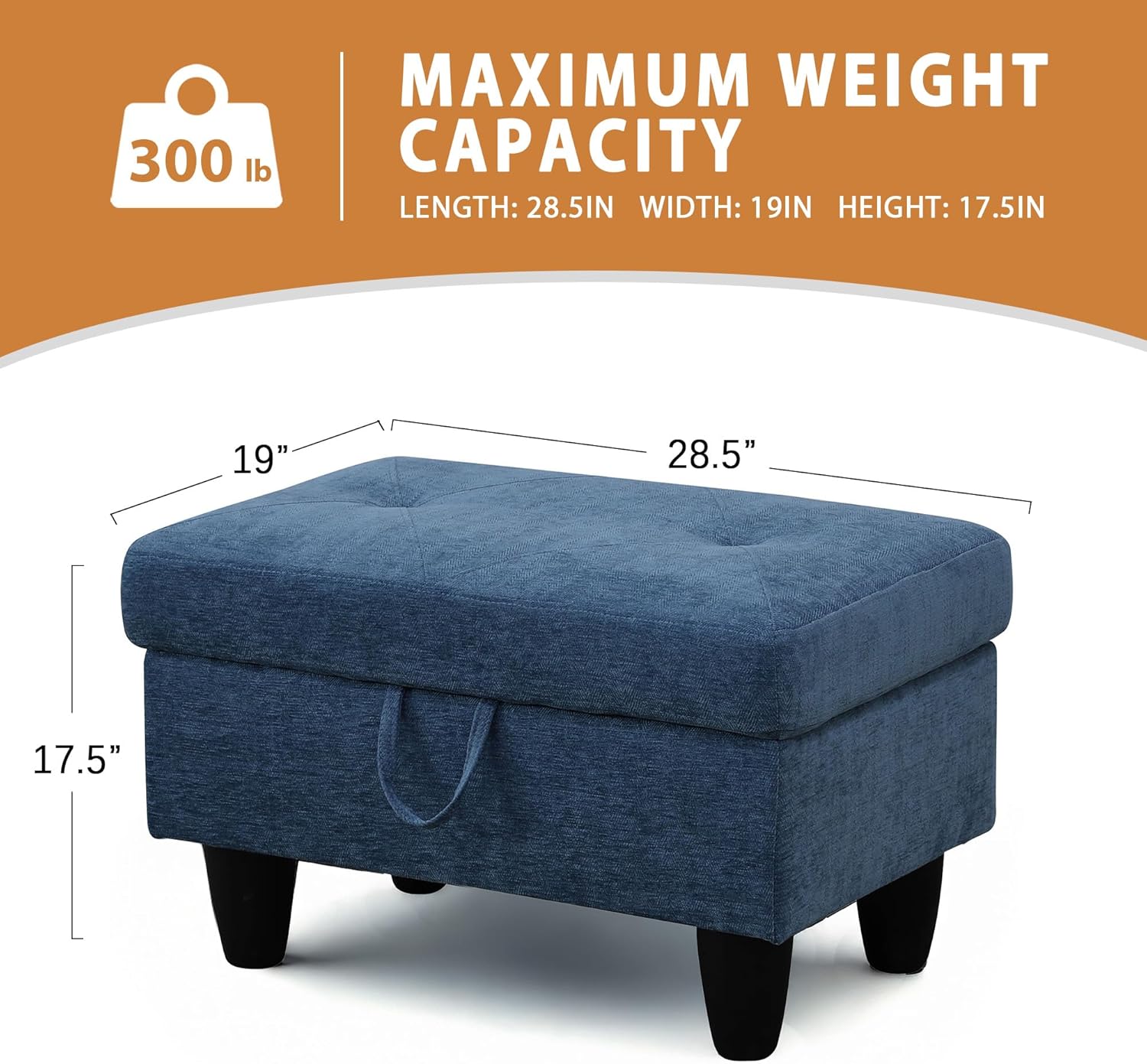 - SIZE & CAPACITY: Measuring 28.5" L x 19" W x 17.5" H, this storage ottoman is crafted to integrate smoothly into any room. With a weight capacity of up to 300 lbs, it provides both a stylish touch and a durable, dependable option for seating or storage in your home.